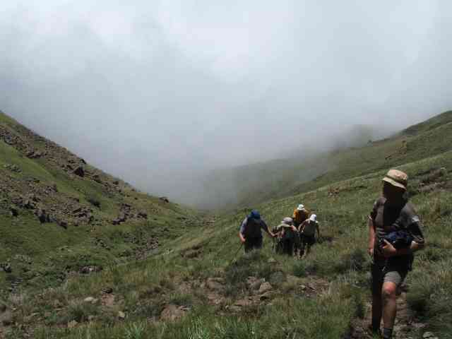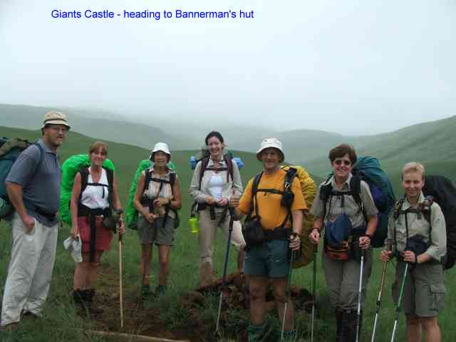 Saturday the 25th November saw 8 of us (Keith, Margaret, Allison, Chantel, Jenny, Lisa, Gerad), meeting at Giants Castle gate – a wet , misty and overcast cold morning. We were heading for Bannerman’s hut, where we would overnight , then head along the contour path to Langalibalele ridge , up the pass to the Carbineers Memorial Cross , and back down again to Giants Main camp later on Sunday afternoon. The weather proved to be as bad as promised , mist , wet and cold. So with that in mind , we put our best foot forward and headed straight for Bannerman’s at full speed – no lunch break !!!!!