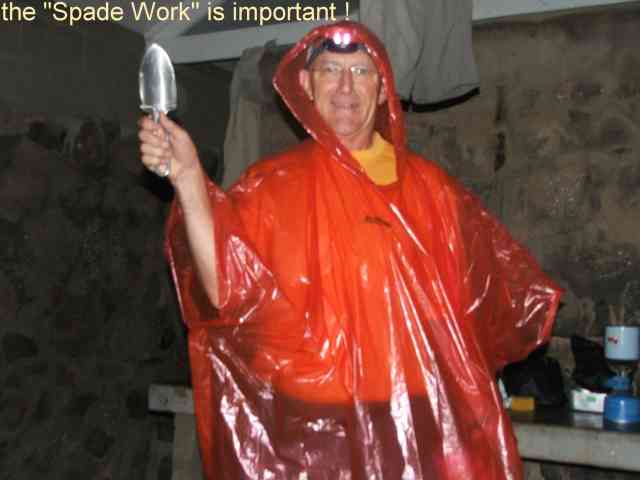 As the water system in the hut was not working ????!!!! , so the indoor toilet was out of action . Sooner or later some needed to take to the outdoors to talk with nature. Not a very pleasant task in the rain – everything gets wet. Some brave souls geared themselves up , and put on a brave face to go out into the elements. Others held back until there was no more holding back – it rained and rained. Then at the last minute , armed with a shining spade, put on the RED fighting cape and headed out into the dark , wet, rainy night, where the long grass was lying bent with water and cold, and waiting for him to ……..