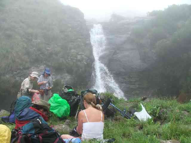 Lunch was had here , a good look at the site and scenery was enjoyed , with the incredible view of a vast sea of white cloud below . It was time to start the long trek down the mountain to meet up with the others of our party at the waterfall , pick up our backpacks , and keep on dropping down the mountain ridges until we reached Giants camp below , a drop of some 1200 meters and some 12 kilometers away.