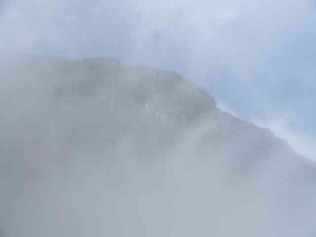 Sunday morning showed promise of a good day , so we packed , had breakfast and left early for Langie’s Pass. With the heavy rain during the night , some of the little stream we had hardly noticed the day before , had risen considerably , and a helping hand was needed to cross at places. Later our hopes for a good day faded as the mist settled back down onto us , fortunately however , the slight rain was absent , so it made for a cool hike , but with limited visibility .When we reached the waterfall at the base of the pass, the mist was still thick , and one wondered – if we climbed the pass , would we see anything on the top ???