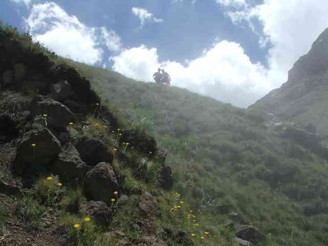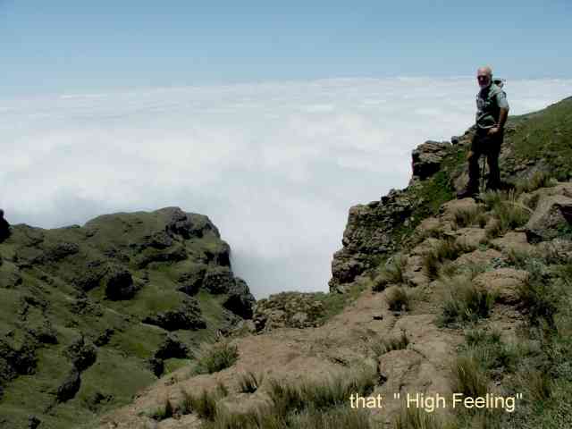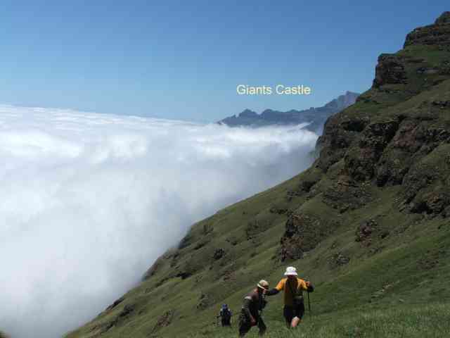 Two of the party decided not to go up to the top, so we left them with our big hiking packs, and armed with lighter day packs with lunch and rain gear we headed up the pass. The mist was thick , the going was easy as one could not see how high you had to climb . Up and up we went , all in a misty grey fog of damp air. Then as we were somewhere near the top , the mist started to thin , and we saw the tops of the mountain glistening in the thin mist above us. Looking back down , a wall of mist hid the valley below . Soon we broke through the mist into a totally different world, blue sky , incredible flowers , and the top of the pass just above us – or something like that. We pushed on , and on getting to the summit we looked back across a white sea of cloud that covered the whole land for as far as one could see , and on the right , the “Giant” of Giants Castle lying on a white mist of cloud.