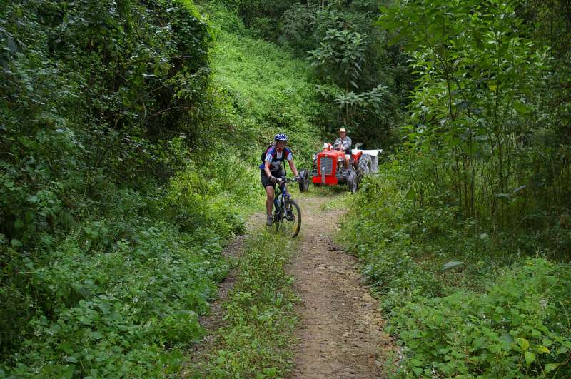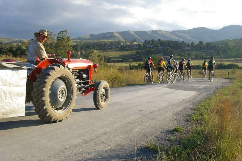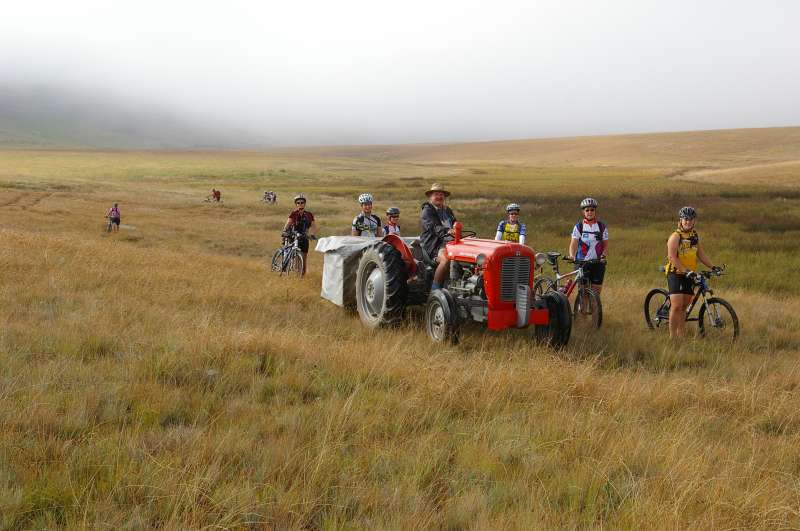 To add a touch of fun to the potentially gruelling experience the riders were trailed by Les Maker of the Natal Vintage Tractor Club on a 1957 Ferguson tractor. A platform attachment was custom made to carry food and refreshments, first aid, tools and bike spares, but also to transport up to 3 exhausted or injured riders together with their bikes. The other vehicle was a Prado with a bike and baggage trailer driven by Philip le Feuvre.