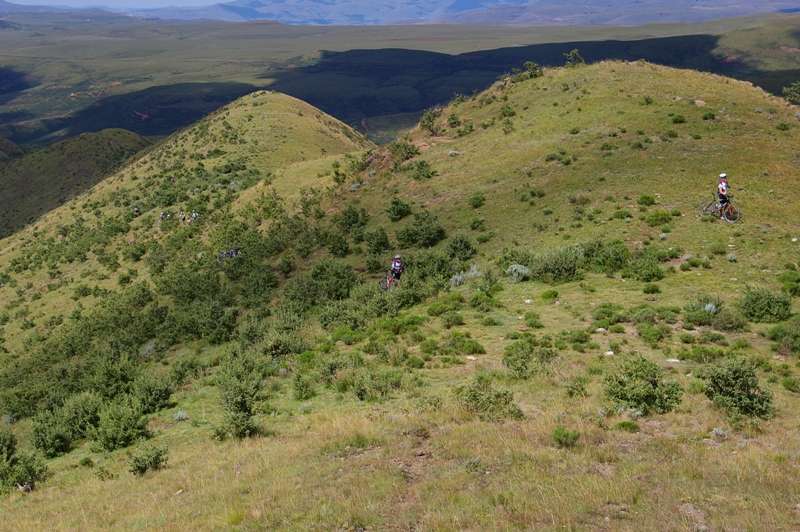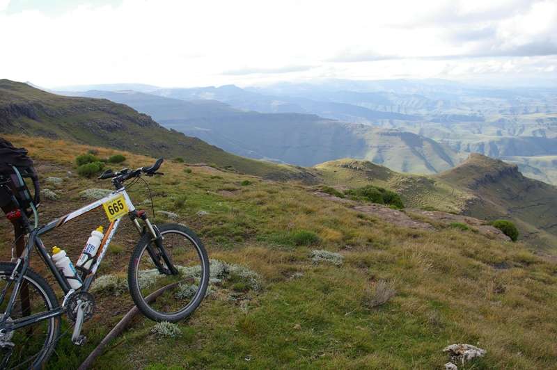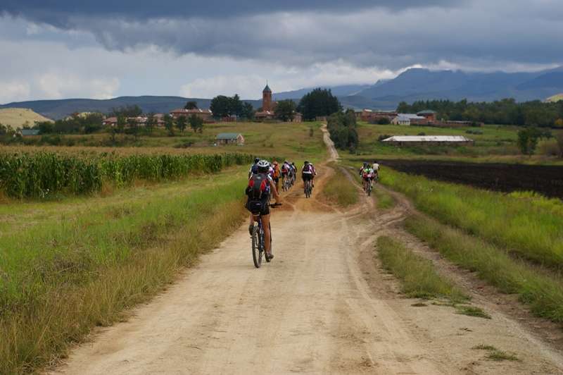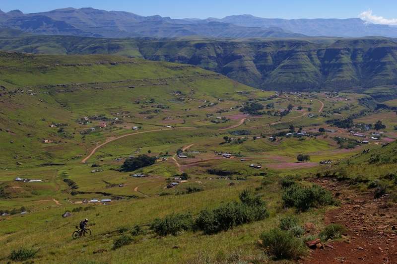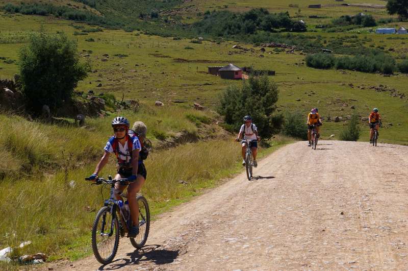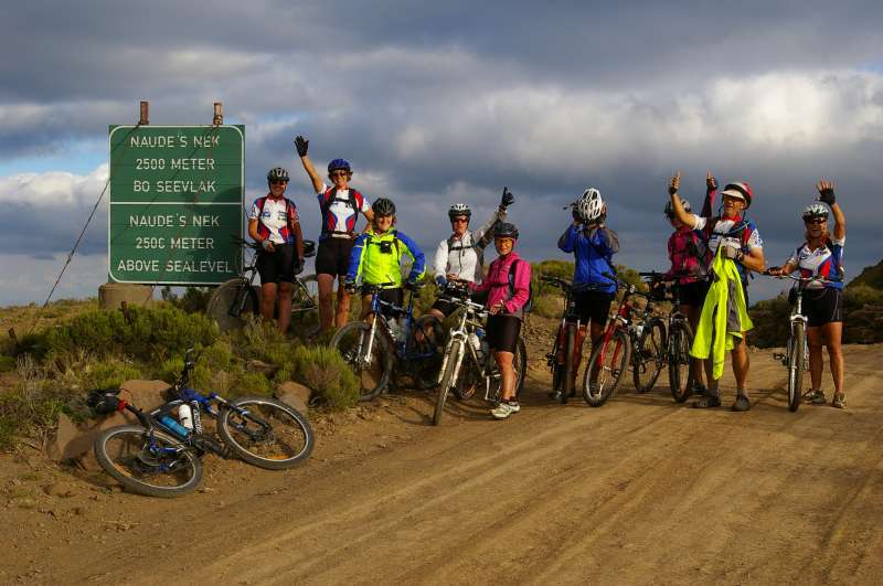 The cyclists had made an early start that morning from the small Eastern Cape village of Vuvu high up in the Drakensberg Mountains. After a gentle ride along the dirt road to the neighbouring village of Ulundi the group crossed the upper reaches of the Tina River and then started the steep ascent up Lehana’s Pass following the tracks of goats and cattle that graze on the mountain. Most of that day was spent hauling the bikes up a 1000m climb to the top of the Drakensberg. On reaching the top of the escarpment the directions guided us to some abandoned farm buildings where we picked up an old dirt track that lead us to a nature reserve and the luxurious Tena Head Lodge. From there it was a short ride to the top of the Naude’s Nek Pass where we enjoyed a celebratory break for group photographs. The end was in sight but not before the final 8km climb took us to the highest point of the ride. With the sun setting over distant hills and the temperature plummeting, we descended 1000m through steep mountainous terrain carefully negotiating the sharp curves and finally at the bottom of the Naude’s Nek Pass were met by our escort vehicle.