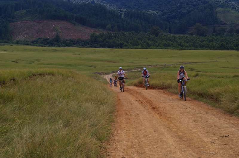 The next day we crossed the boundary river at Riverside and entered the old Umzimkulu district of the Eastern Cape. The terrain was fairly flat so we were able to make up the time we had lost after taking a wrong turn that took us through an indigenous forest to a high vantage point. After a peaceful rest and a good lunch provided by the Mission, we parted from the tractor and headed up towards Nsikeni Peak through shady forests and plantations emerging in the late afternoon just below the peak. We followed cattle paths in the light mist until we reached the 2 m high boundary fence, climbed over with our bikes, and found our way to the luxuriously rustic Nsikeni Lodge where we were met by our support team and our host Jean, the mother of the Waddilove brothers.