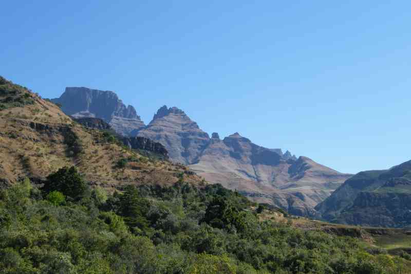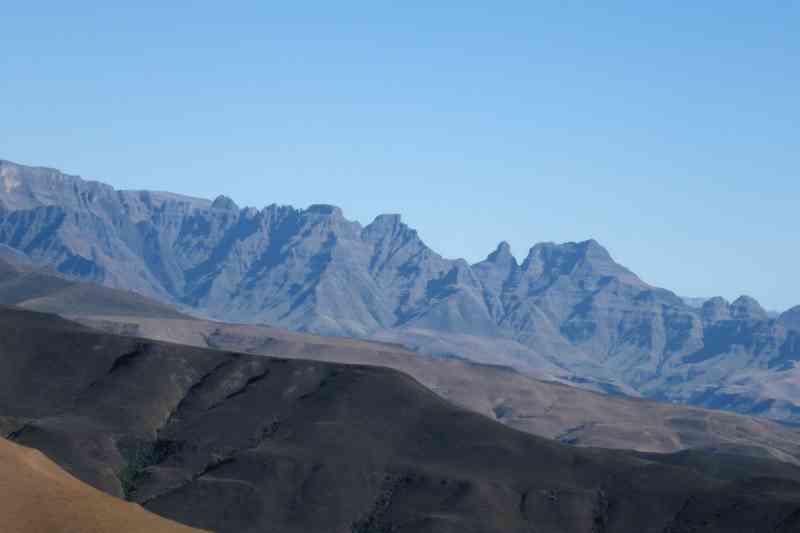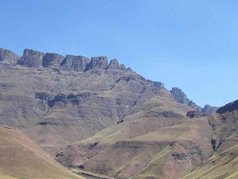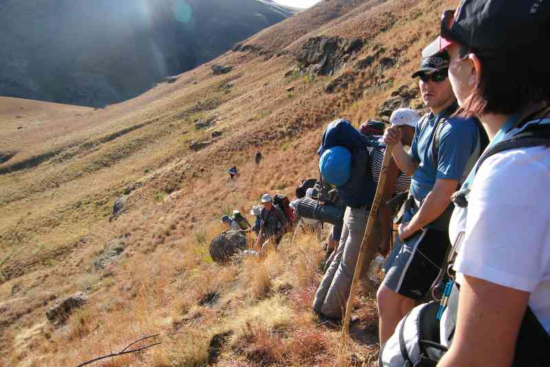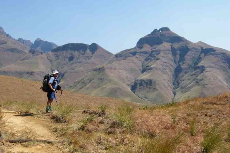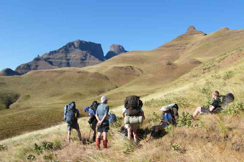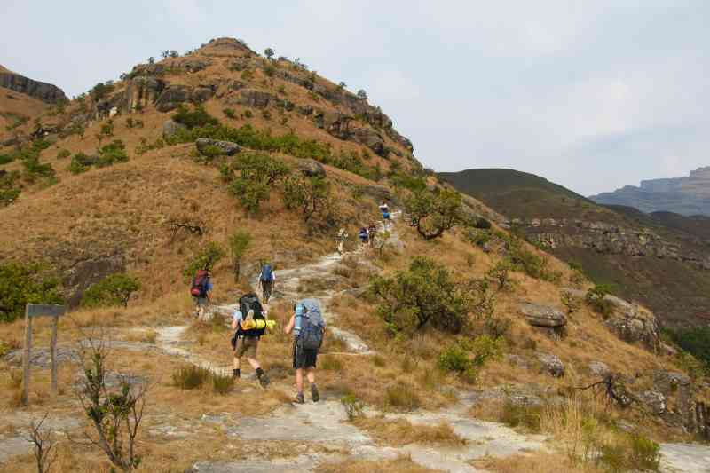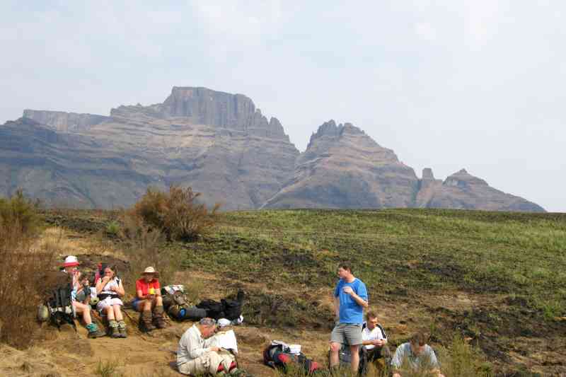 Later we stopped for lunch at Hlatikhulu Nek , where we were to met Brian , Mark and Mary, and a group of hikers who had hiked from Mary’s Cottage to meet us at this point. By now the wind was strong and horrible. Lunch was taken in the shelter of an old path cutting. On the way to meet the other party, Intunja stood out before us, high and with steep sides. We met up with Brian and co., however the wind was by now really strong and unpleasant. So after a short meeting, we decided to move on to Zulu Cave, and Brian and his party would hike back to Mary’s cottage , from where they had started in the morning.