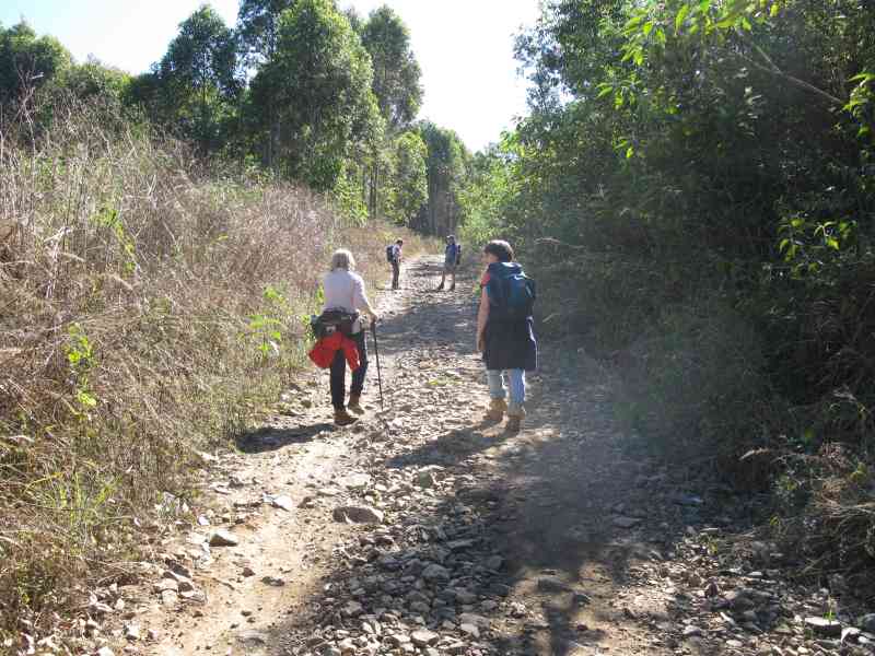 A slight deviation in the hike from what we did earlier earlier this year brought us, after passing some colourful washing, to a giant Bluegum tree (don't let WaterWise know of it's location or it will be turned into woodchips...) what a magnificent tree, though very difficult to get a photo that adequately shows it's size, stand close and you can't fit it in the frame, stand back and you lose the size perspective, so accompanying pic is a compromise. Here the trail reaches its lowest point and from then it is all uphill, though my uphill pic doesn't do justice to how steep the hill felt - it is one of those that you have to be there to appreciate!