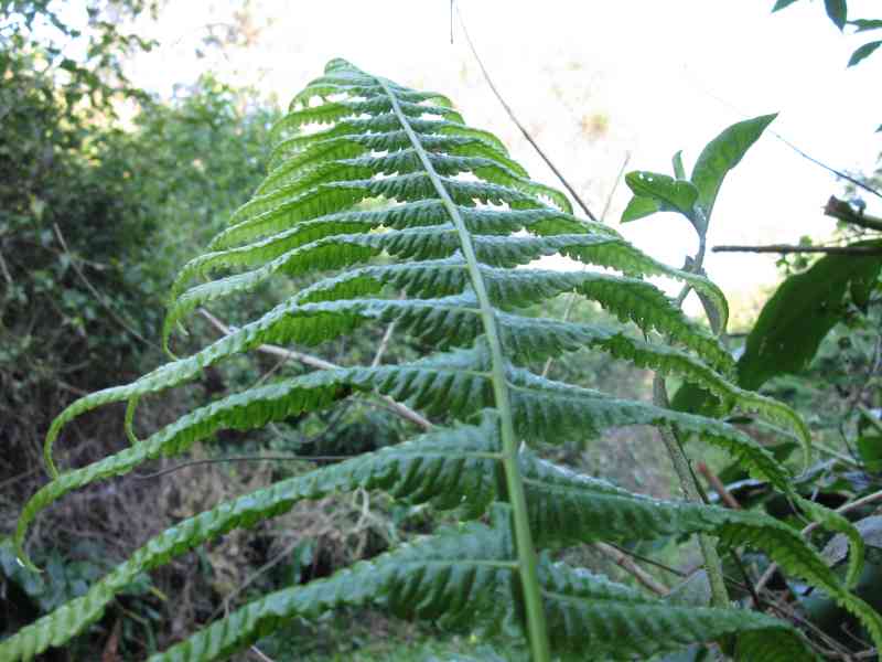 At some time past 09:00am when we started climbing from the Warick Road route back up towards Boulder Dam the ground was sodden and the going slippery, as the first photo in the set below shows hikers had to put their backs into the uphill haul. And of course when you slip just everyone turns and smiles(...and Rose has camera ready to record the muddy patch)! In the same area that the slipping and sliding was going on I found a fern leaf that, to me, conjured up the image of a flock of birds symettrically flapping their wings in take off - I tried to capture it in a photo. Another find was a cast off Bugweed leaf in a shadowed area covered in water droplets catching the light now coming through. Note two points about this is that firstly Ferncliffe is a mistbelt forest area and secondly the area in now degraded through alien plant invasion.