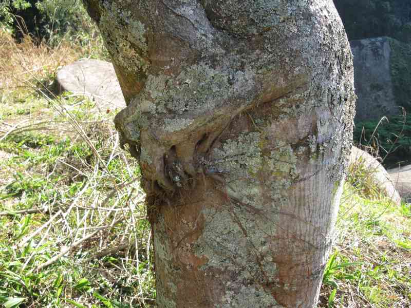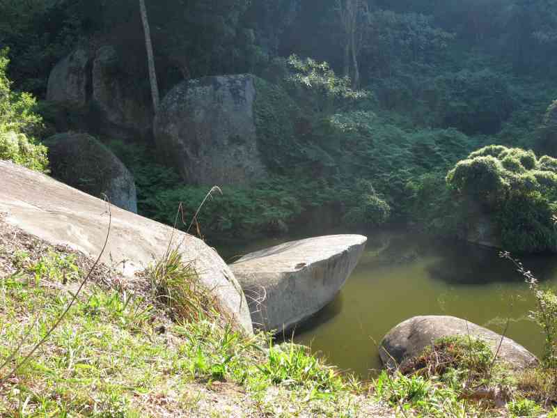 And so onto Boulder Dam where we had a quick refreshment break. Note the tree on the left in the first pic of the set below, the second pic shows a closeup of its trunk having a root growing out midway up the stem and hugging itself - from the pic it looks like some giant reptile has launched out of the dam and is clinging to the tree - definitely not the place for a night hike! From the third pic no prize for guessing where the name Boulder Dam comes from.