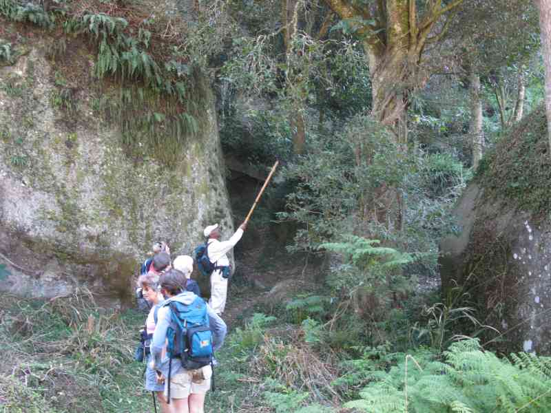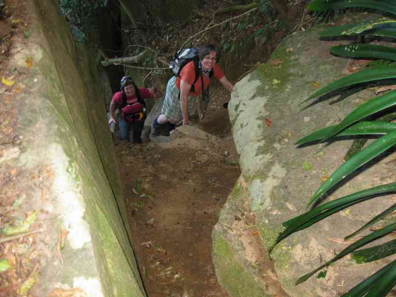 Growing, growing, growed... Rose names her center pic of this flower sequence a "Scadoxus" so I will trust her on this one, I have added the pics on either side and I think they are the same plants at different stages of growth. Not sure if the next tree pic is another strangler fig but the pic shows the crossmeshing root system of a tree that has latched onto a host and is not letting go! And so onward now to Breakfast Rock, clambering over fallen trees and , rock-rabbiting up rock gulleys to the top and a welcome midmorning refreshment break looking over a (somewhat hazy) view of town, Greys Hospital in the near distance. Note the stone bench that has been built on top of Breakfast Rock and certainly fits in well with the environment and adds to the occasion by providing something on which to sit back and rest. Close by is a rock reminder of the manner in which rocks were split in the "old days" showing the remains of drilled holes in which chisels would have been placed. Refreshments and break finished we set off back down the rock gully.