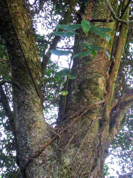 Selven points out a strangler fig which has attached itself to a tree and which will use the tree as a backbone, eventually to overwhelm it - to add to the host tree's problem Selven points out a Wild Ginger plant which has grown in a crook in the trees stem, shows just how prolific alien plants are at spreading. A short distance further single leafed plants cling to the rockface, in the pic of one of these single leafed plants you can detect the fine root system radiating out from the plant latching it to the rock. Further along the track out of the wet area brambles produce an appertising looking berry, and then a birdnest which well is just amazing that a bird can build such an intricate nest out of twigs.