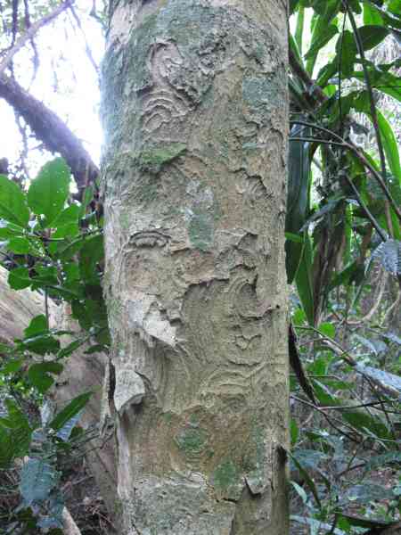 First photo stop was for a little "Fairy umbrella" (minus the fairy), not recommended to add this mushroom to the salad for colour. Crystal clear water droplets on a leaf - strangely enough I think it was also a Bugweed, must be something about the furry texture of the underneath of the Bugweed leaf that keeps the water from draining off. The photo of the log "bridge" makes the point that the Ferncliffe trails are overall well maintained, unlike the Bisley Valley trails, same municipality - make one wonder why one and not the other? Bat Cave is, for environmental reasons secured with a gate which while keeping inquisitive humans out, will enable bats free access. An earlier (Nov 2006) MHC report on this hike by Erica Adie mentions the hikers encountering two researchers emerging from the cave and the researchers were only too pleased to spend time with them explained the peculiarities of the bats that inhabited the cave (refer Ferncliff Report by Erica Adie). My pic is taken at the entrance (as far as I could reach in with my camera!) looking inside the cave. Selven pointed out to us that you could identify the Lemonwood tree by the unique pattern of whorls etched into the stem under the bark, as shown in the first bark pic below (in this pic the Bat Cave gate can be seen in the left of the pic). Further down the track I came across a Lemonwood with even more whorls visable