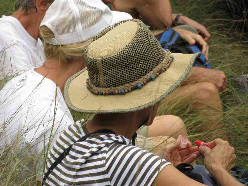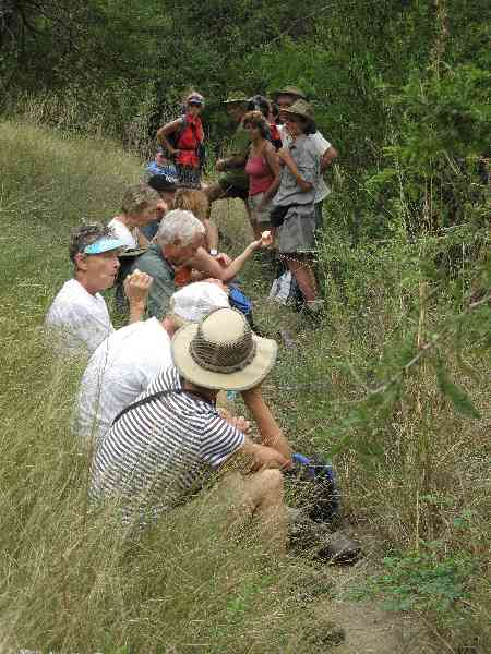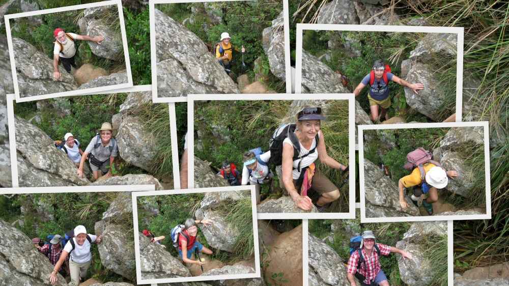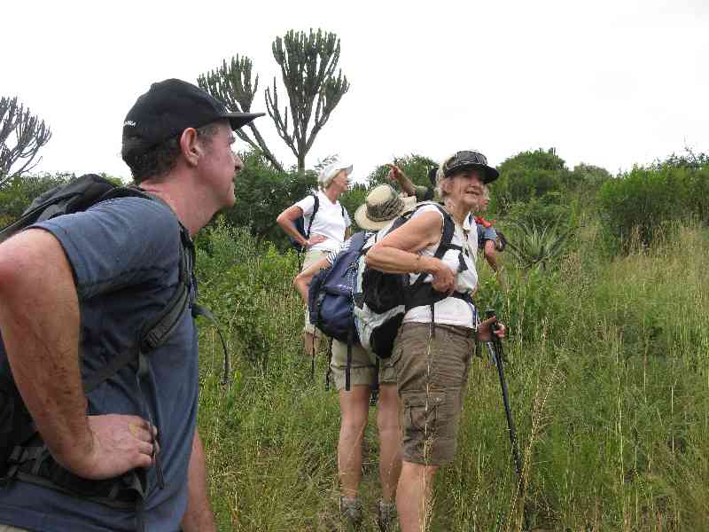 Now we did start our descent into the valley (pics 1 below), and were grateful (throughout this trip) for the overcast weather, whilst humid (hence the aforementioned bio-hazardous hiking gear I returned home in) we were spared the blazing sun and temperatures of the past few days. A solitary weaver nest hung somewhat forlornly over our path (pic 2). I spotted this interesting cactus like thingy which was sprouting leaves (pic 3) which I thought at the time was quite unique but according to my Google search it seems quite regular for some species and may be an "Euphorbia Ingens" (or similar) . The descent was quite arduous in places with avoiding vines and scratchy things (pic 4), that is Max's grandson, along on his second major hike, in the centre of the pic in front of Margaret. A short stop for water (pic 5) then a more serious break for a snack (pic 6) - note the decorative (yet still very practical) headgear being sported (pic 7)!