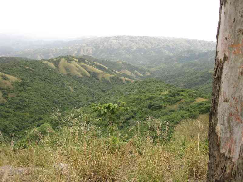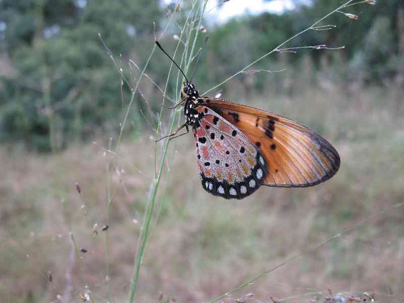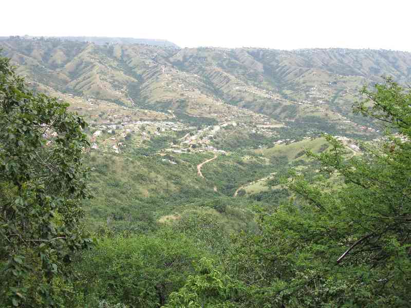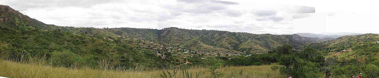 As we turned off the road to now start our descent we climbed first to the top of the hill where Max pointed out the old jail (pics 1 and 2) which had a prime view of the valley, we temporarily incarcerated Keith in the jail (pic 3), only to find that the oddly designed building did not have a back wall to the section Keith was in! Rose meanwhile had discovered a butterfly resting on a stalk of grass, though it unco-operatively closed it's wings when I came it did stay around to have it's photo taken (pic 4). Our next stop (still not having gone down into the valley yet) was at the Valley of Thousand Hills viewpoint along the old road, and view the view we did (pics 5 and 6)!