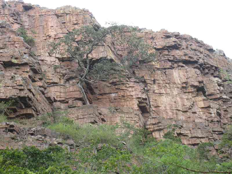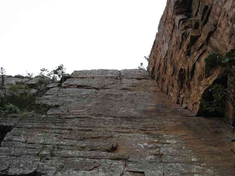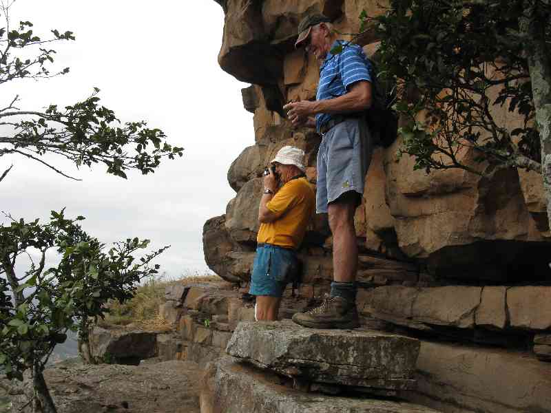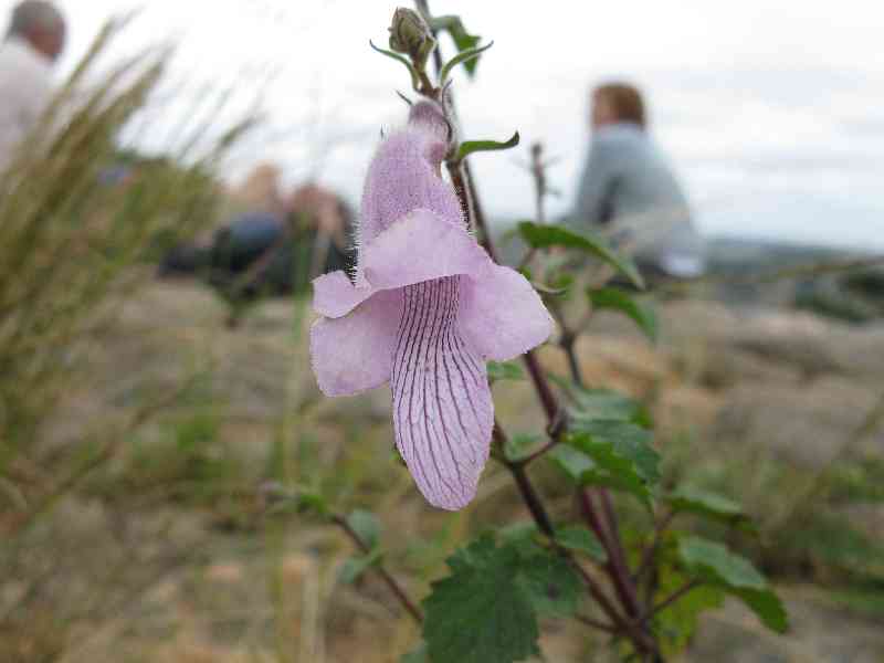 Keith meanwhile had temporarily discarded his crutches and gone clambering along the cliff face onto a rock ledge to a better vantage point to see the view (pics 1,2,& 3 below). On the way back along the ledge we spotted Max's grandson high above us (pic 4) at what was to be our lunch stop, Rose's pic (pic 5) shows Max and some of the ladies tucking eagerly into lunch. My panorama (pic 6) shows the view from our lunch place. I spotted this Ceratotheca Triloba rather rudely pulling a tongue at us hikers (last pic - thanks Rose for the name and ref.(pg435 Wildflower Book))