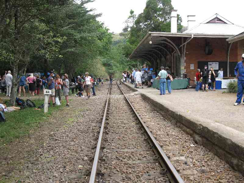 But I digress, back to the hike, Rose has provided a stunning collage (pic above) of "Happy looking Hikers" emerging from the rocks, thank you Rose for your effort there, some of the pics that follow are also courtesy of Rose, and where they appear I will indicate credit to her. Getting started, Rose captioned her first pic "twenty-two Eager Hikers" that's me (Rod) on the extreme right of the photo. Starting out from the back of Max's garden we stepped out onto the railway line (pics 2 and 3 below of forward facing hikers, courtesy of Rose, my pic (third) shows the view from the back of the pack) and began our hike, our first stop being a short while later where Max (see pic below of Max, with cap and beard) explained some of the history of the line, which was completed in 1880 though officially opened some years later. Max showed us where the original station had been though there is unfortunately nothing left of that now.