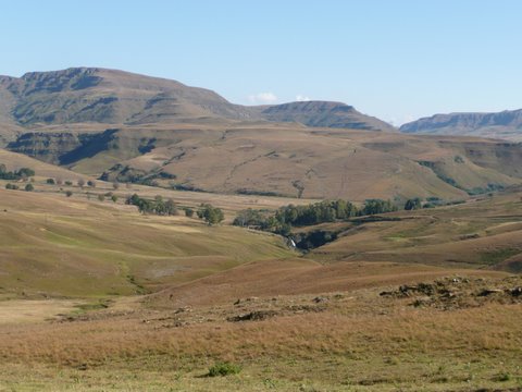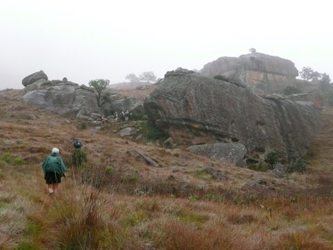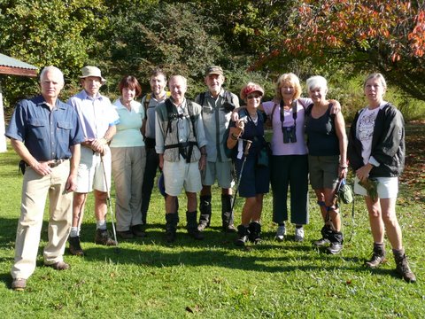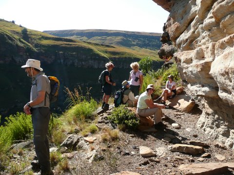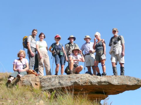 It was a glorious day as we all headed off to The Spinney, two delightful self catering cottages, located next to the Mkomazi Reserve and just 14 kms off the tar road, where we were welcomed by Jan and Russell, the owners, who turned out to be the most delightful hosts. Those who had arrived earlier in the day did some exploring and then in the evening we all gathered at the main house where a delicious meal of chicken casserole, vegetable tart and rice followed by plum panecotta ,chocolate pudding and cream was provided by Jan at a very nominal cost. Not even this team of hikers could devour the full spread placed before them. After lots of chatter and merriment we all headed off to our individual accommodation where everything from linen, crockery, cutlery and cooking facilities together with unlimited hot water and electricity was available. As we walked the sound of the wind rustling the trees was very prominent and this did not bode well for the next day. During the night the wind escalated and brought the rain. We woke to heavy mist but, after some debate, decided we would keep to plan and venture out to MacKenzies cave with Russell in the lead. The mist and rain showers persisted through out the day and whilst we were not able to take in the scenery we were still able to enjoy the last of the spring flowers and the variety of grasses not to mention the awesome rock formations. After walking for more than 3 hours, crossing several streams and climbing some 600 meters it was unanimously agreed that we would forsake having lunch at the cave and head back to base. Two hours later, after hot showers and donning clean, dry clothes we were again welcomed to the house where hot, home made soup and tea and coffee was waiting. The group then assembled various salads, Rose and Christie plied their skills and produced the most enormous and colourful fruit salad and the fun began. The thought of braving the elements again was not negotiable and if you have never heard of braaing meat on the hearth-well we did! Again a good evening was had by all.