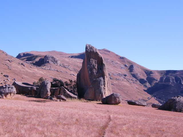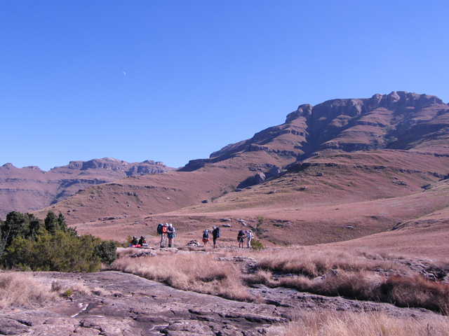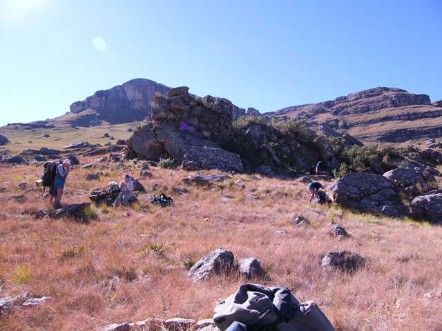 Sunday woke with a weak sunrise, but turned out to be a great warm hiking day. It is down hill all the way to the cars. One of my favourite places in the berg is at Pinnacle Rock. This huge rock points high to the sky from a large grassy plain, but to me it has a very special peacefull feeling about it. Walking down the stream was a bit prickley as the path goes through the valley floor which is thick with sharp spined porcupine grass.
