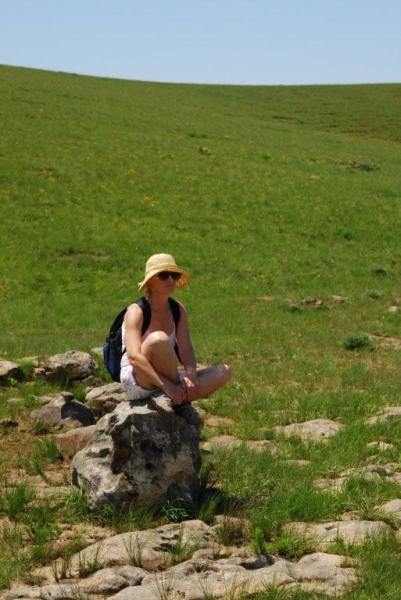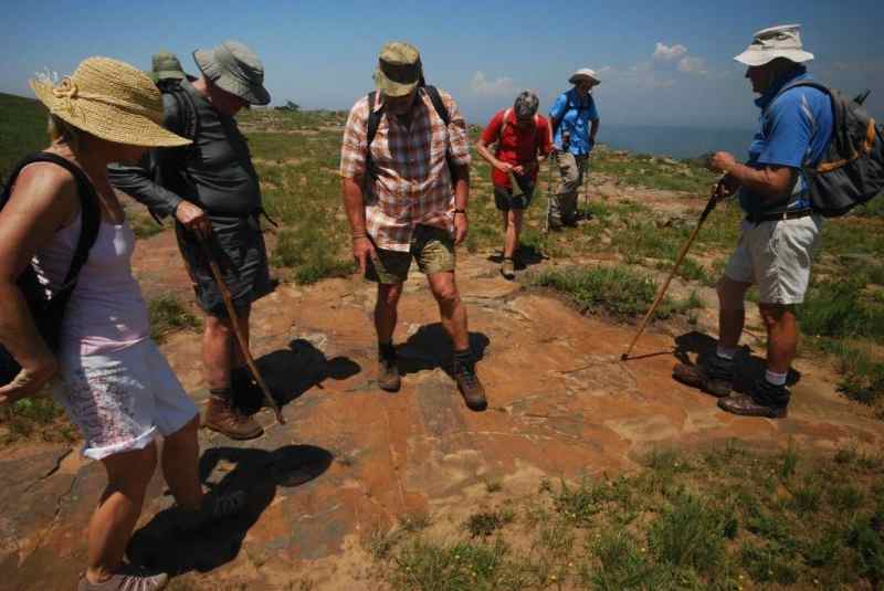 The top is a landscape of soft, undulating, green Natal grassland, covered in flowers at this time of year and dotted with cattle belonging to the locals whose dwellings stop at the base of the steep ascent to the top. We spent the day meandering our way around the perimeter of the table top, able to indulge in time to enjoy scrape marks in the rocks from long-gone glaciers, interesting sink holes which sheltered the only trees and bushes that occur up there, insects and plants that caught our eye, and the occasional bird. The mystery of a trail of blood which we had picked up on our ascent was solved with the discovery of a day old calf nestling in some bracken – concerned mother was nearby! A dramatic view out over a somewhat hazy Natal accompanied us all day. Allison was able to plot for us the various stages of the Dusi canoe race, and further round we had a magnificent view of Nagel dam and the Umgeni river. Top marks to Allison for her choice of lunch-spot! This was on a shoulder that reaches out from the body of the table top and into the Umgeni Valley. Lots of exposed rocks set with aloes, it narrowed to almost a knife edge before the punctuation of a single, separated column which would have taken quite some scrambling to get to. We gloried in the views of Nagel dam, in the swifts, swallows and martins .. and the occasional hadeda! .. which were plying the strong winds that swept up from the valley, and generally absorbed the peace of a truly beautiful day … well, beautiful for the nine of us who ventured out into the brilling sunshine that morning!