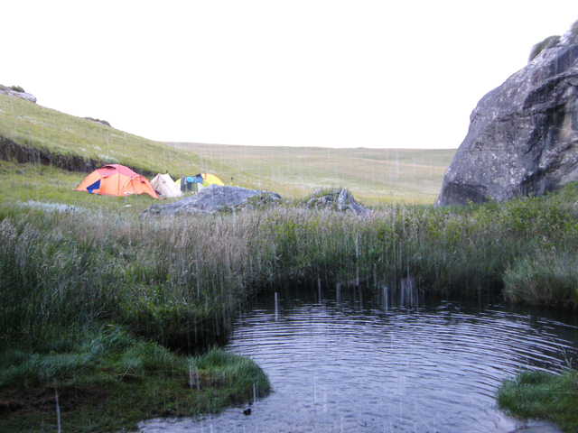 Early next morning I went up the hill, however the sunrise was a bit drab, the high point in the berg known as The Tent at Lotheni was visible from my position. The tenters were still warm in their tents , and the early signs of Autumn shades was visible in the grasslands beyond the tents.