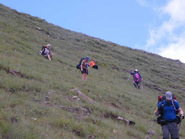 Then it was to set our backpacks and head for the cars. The morning was bright and clear, and the views of the Drakensberg were great. I tried to find a new route back, however, due to the nature of the valleys and hiils, this was not possible , but we did find a new valley that would ultimately lead us to the main path. It was steep going in places, and again we relied on game tracks to get us along the way.