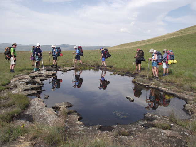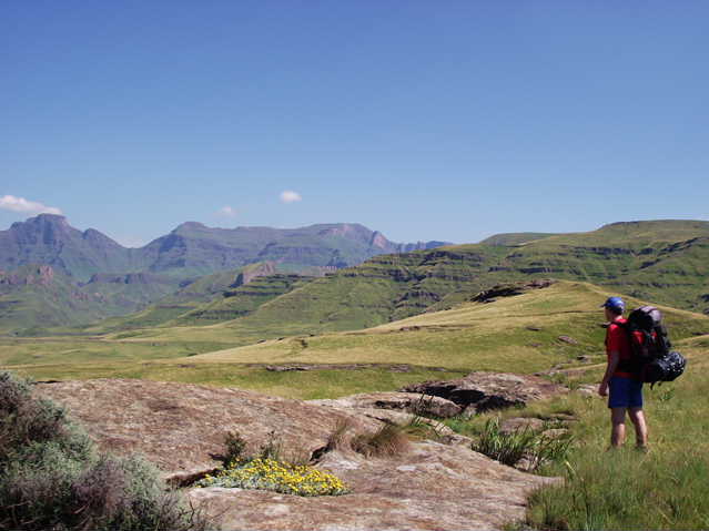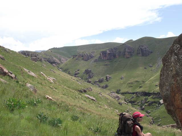 The day was hot and clear, with great views all around us. Plenty of recent rain had kept the grass green, the streams fresh, but at this time of the year flowers were few and far between. Rounding a corner we looked straight up the well known , and challenging to climb, Rhino Peak.