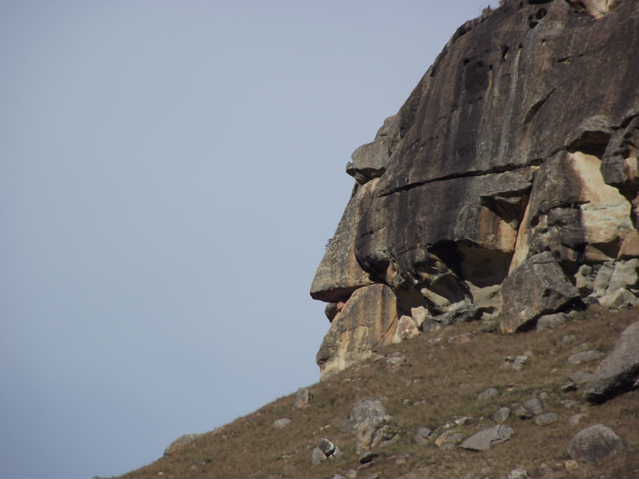 It is always worth a good look at the high rock bands – you never know what you may see sculptured out of the rock by wind and rain. Sometimes these scenes are only seen with specific sun shine falling on them . In this case a strange “ alien face”, and another ancient face looked across to the vast mountain range