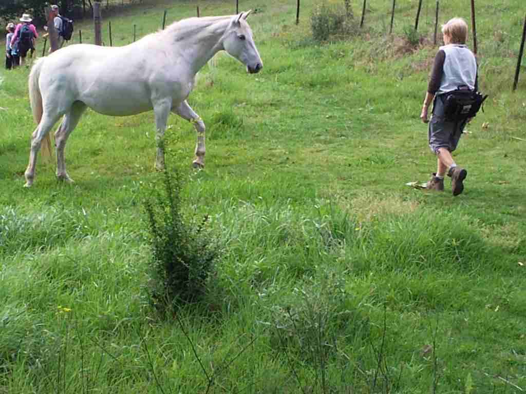Two rider less white horses escorted and followed us to the properties perimeter. We crossed a wooden bridge over a sparkling stream and the trail commenced.