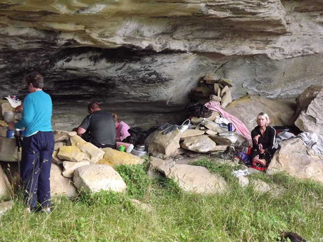 After quite a few stops due to some cramping, and the heat, we reached the cave, packs unpacked, tea brewed, and a few headed into the nearby cliffs to get fresh running water from a spring that rises high above the cave.