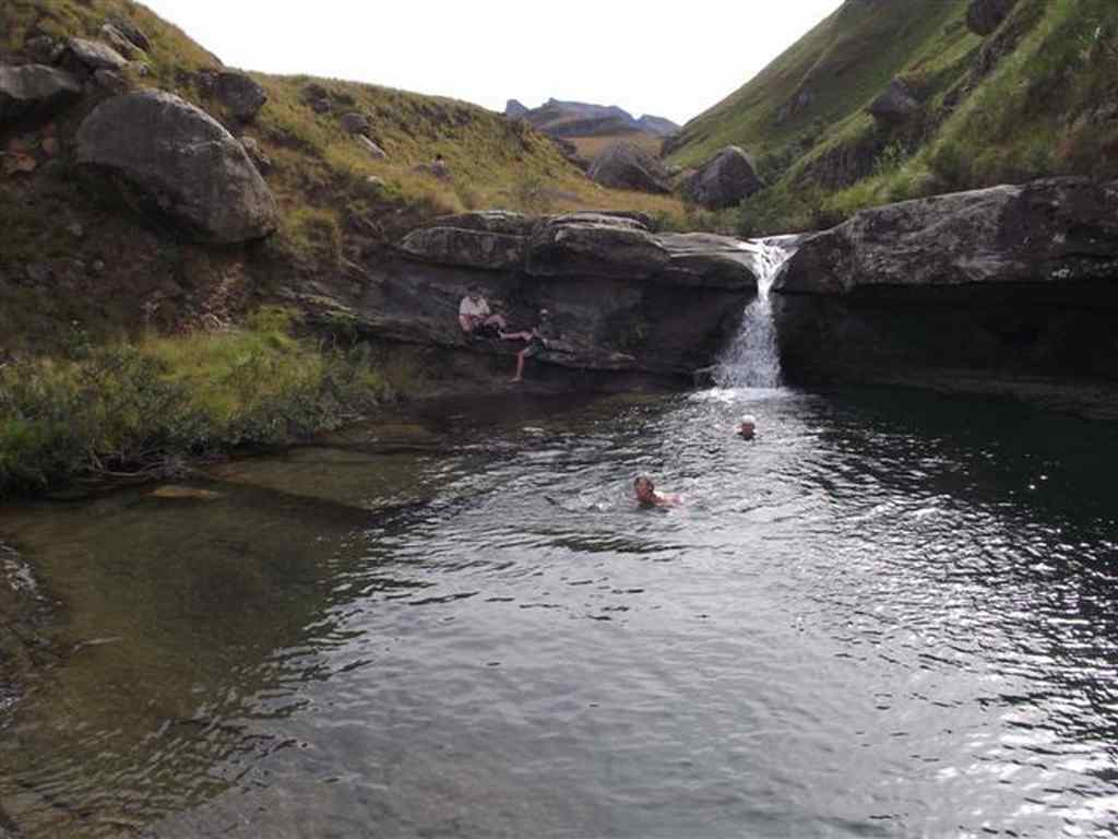 On our final day (SUNDAY) most people wanted to be away by 13h00 so Keith planned a shorter hike up the valley towards Slab and Bushman’s caves. Apollo, Jacqui and daughter Hannah deciding to stay in the hut as Apollo had serious blisters and Jacqui had sprained her ankle. After about 3km we stopped at the river and Christie decided to stay and have a skinny dip on her own. The rest of us walked about a further 2kms to a delightful waterfall and pool for lunch and then picked up Christie on the way back.