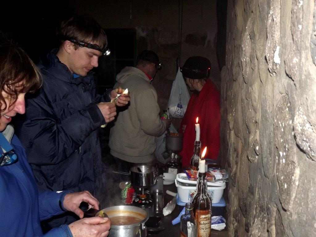 The main “happy factor” was that we were in a solid hut, no wing , no rain, and a dry place to change into dry warm clothes, prepare some hot drinks – with of course the necessary “medical cough and cold preventative remedy” added to the hot chocolate. Supper was a very warming and cozy experience. With much chatter, and later into a warm sleeping bag , just too greatfull to be in a hut and not in a tent or cave