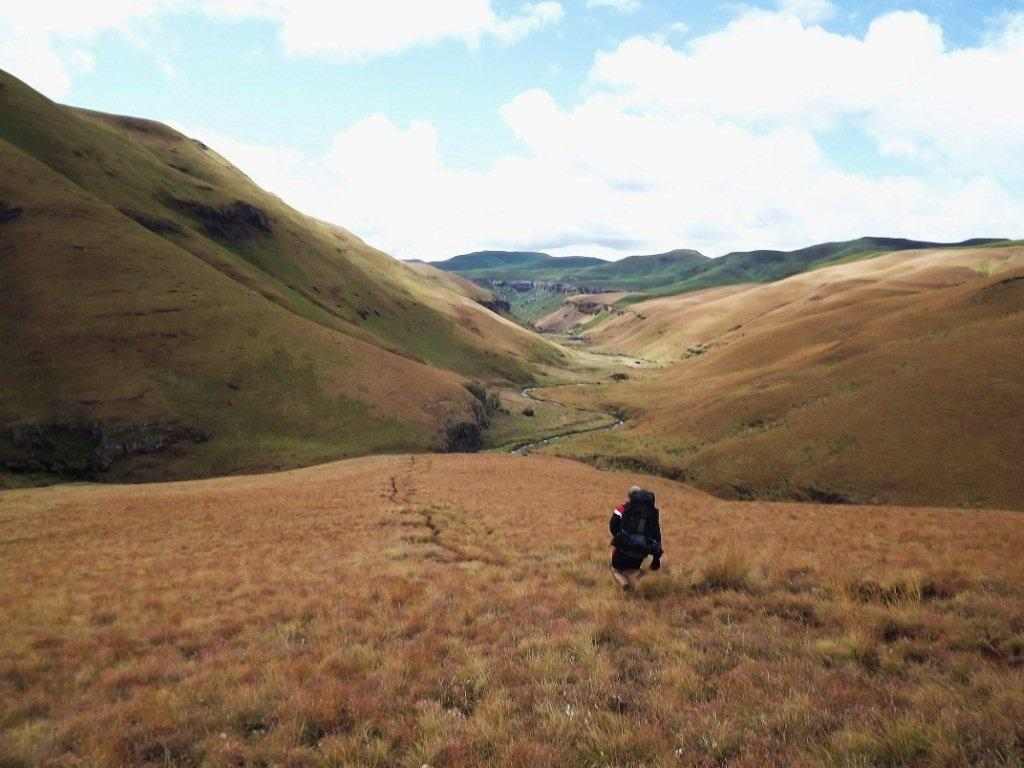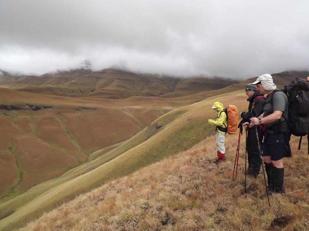 We had decided to go back to the cars via Langalibalele Ridge, so after a slow breakfast, we packed and left. By now the sun had cleared the mountain a bit, but shortly after, we had to stop and put on wet gear again as the weather had turned again.