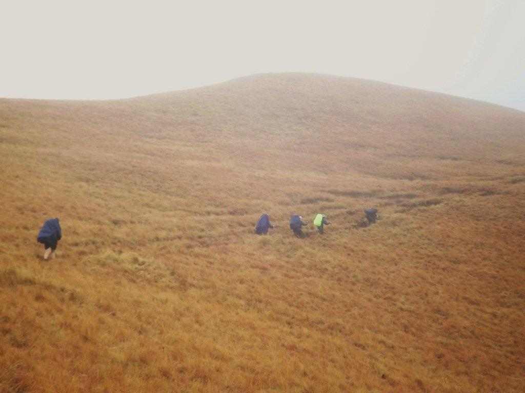 We pushed onto the junction of Langies ridge from where we would now turn “downhill all the way to the car park” , however the weather still did not want to share the mountain views with us.