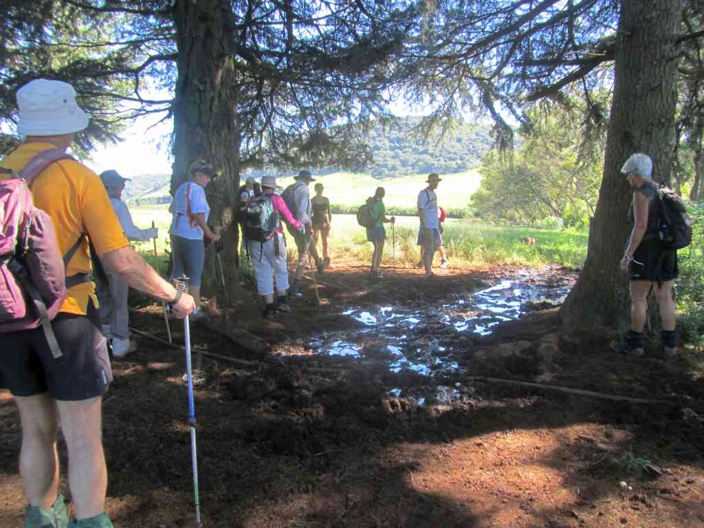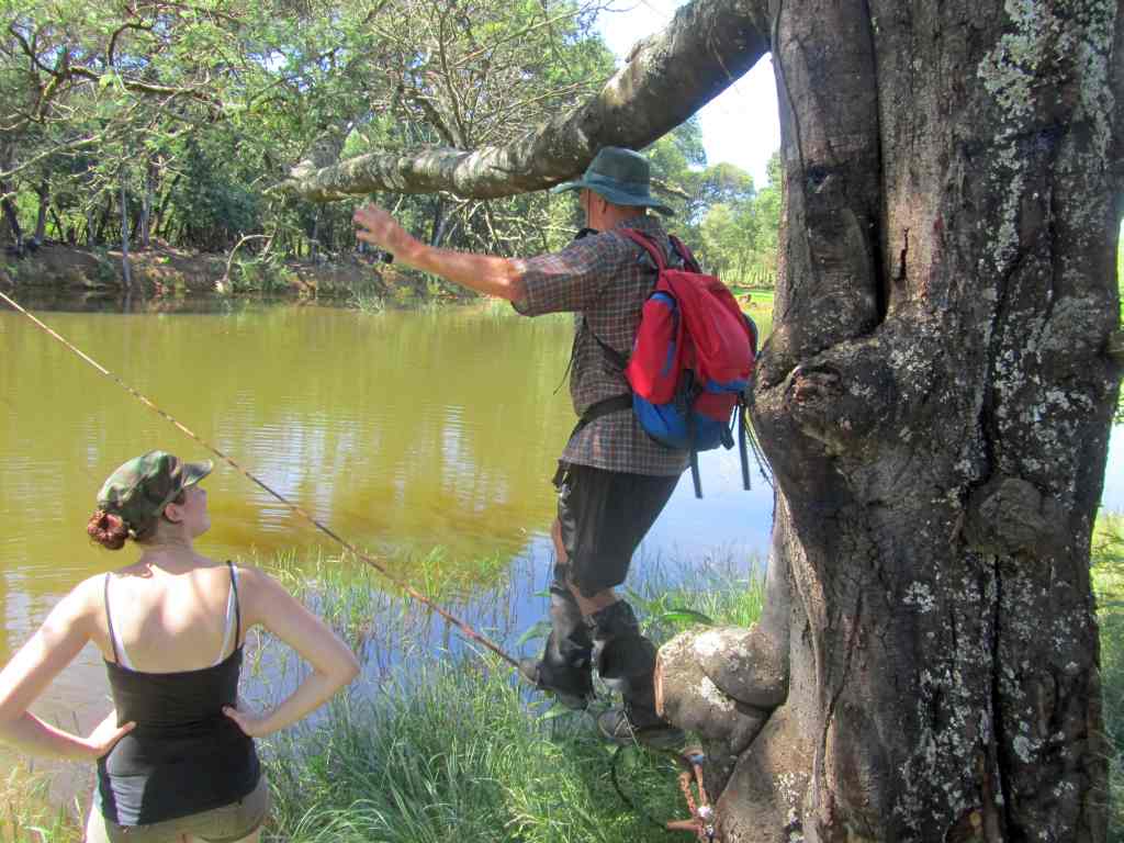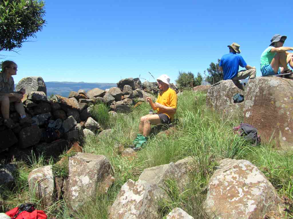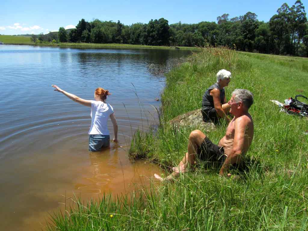 Despite his best efforts (while we lazed over an early tea break) John was unable to find a suitable alternate crossing. The revised plan was to head up to a viewpoint and lunch up there. Under the late morning sun the climb was hot and steep, but was rewarded with a cool breeze on the higher slopes and good views of the surrounding countryside and distant mountains. The return trip down the hill was a pleasure and a stop off at the dam for a swim for some was a highlight of the day and lured many in clothes and all.