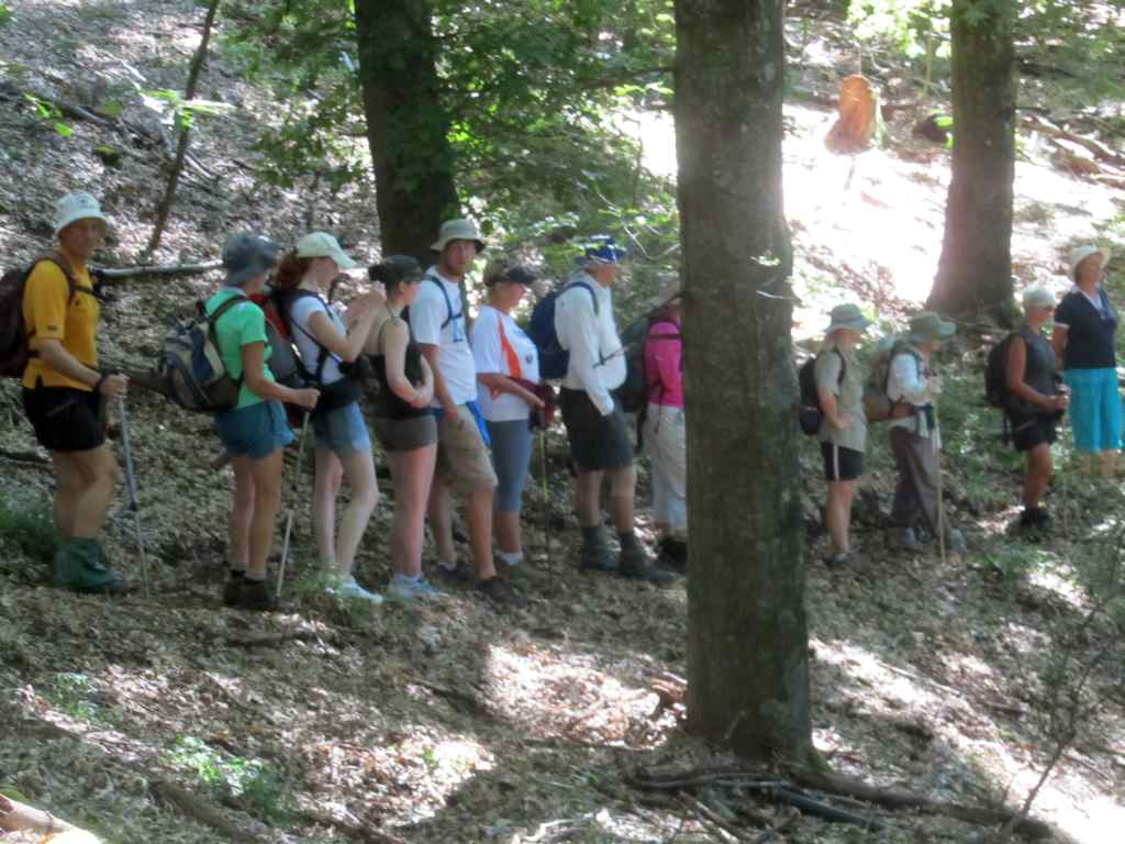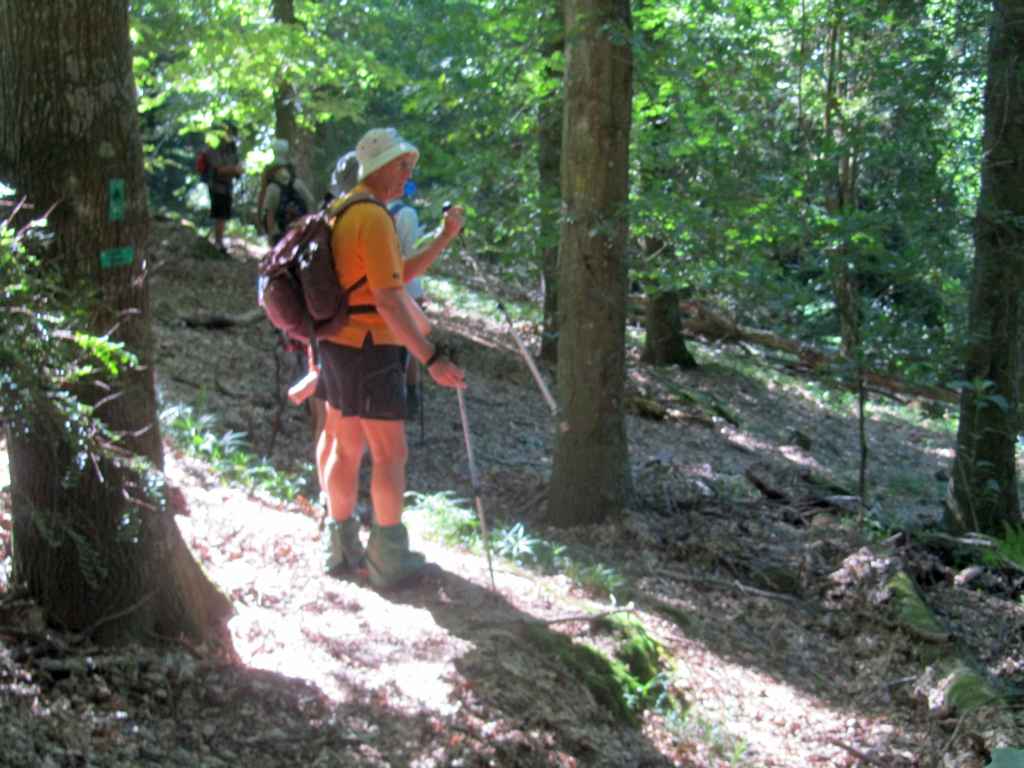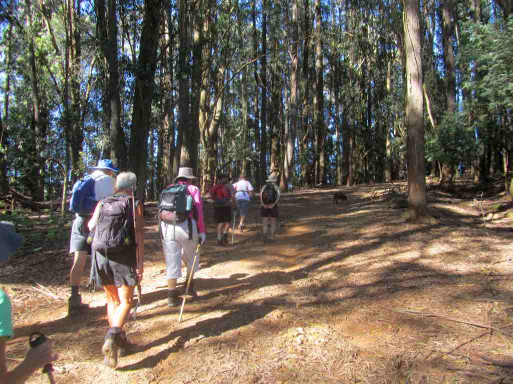 Pic 3 - and we are off, into the shade of the tall eucalyptus trees. Initially we overshot the track, in part because of the insignigficance of the small green track markers nail to the trees.