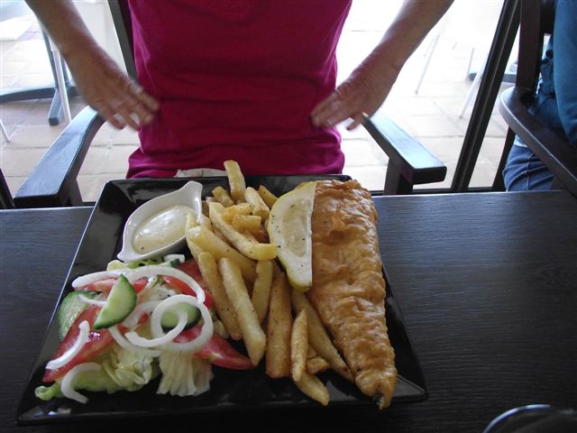 35. Carolee checking her waist before we all tuck-in to a delicious fish and chips lunch
