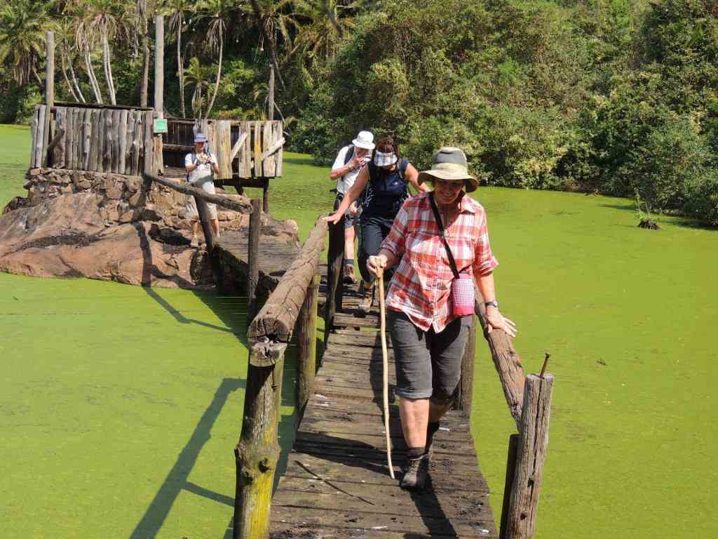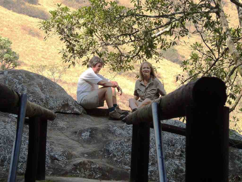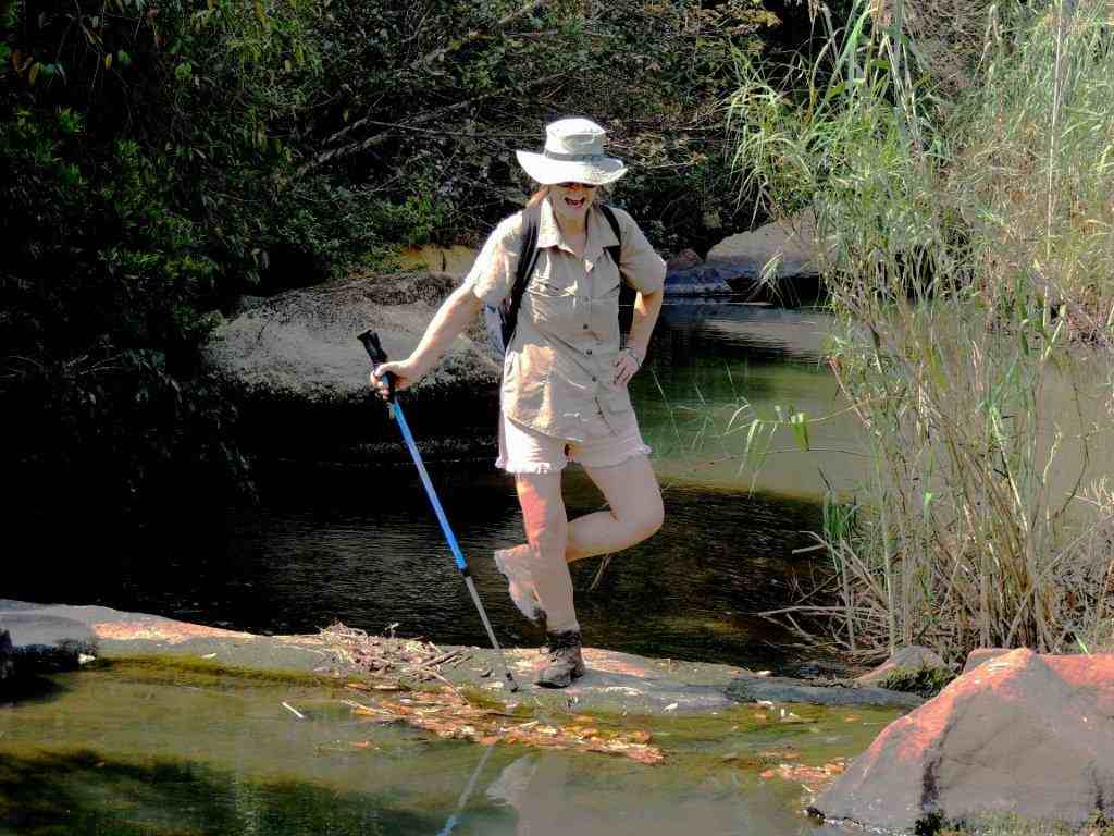 11 of us met at the start point of the walk and once we had sorted and paid our dues, Bushy led us off for the day. The path leads down into the valley , along the river where there are a number of places to rest, a very inviting cave area where our first break was enjoyed. Then up and down to the very “algae ridden dam” with its very rickety causeway onto a rock island from where we could observe the resident hippo, then back along the road where one or two river crossings were encountered. Then onto another camp site where, under in a comfortable boma area alongside the river, lunch was enjoyed. The camp site had very rustic, low and small, thatched 2 mattress sleeping areas for the more adventuress campers. The temptation to have a relaxing Sunday afternoon sleep was very hard to ignore.