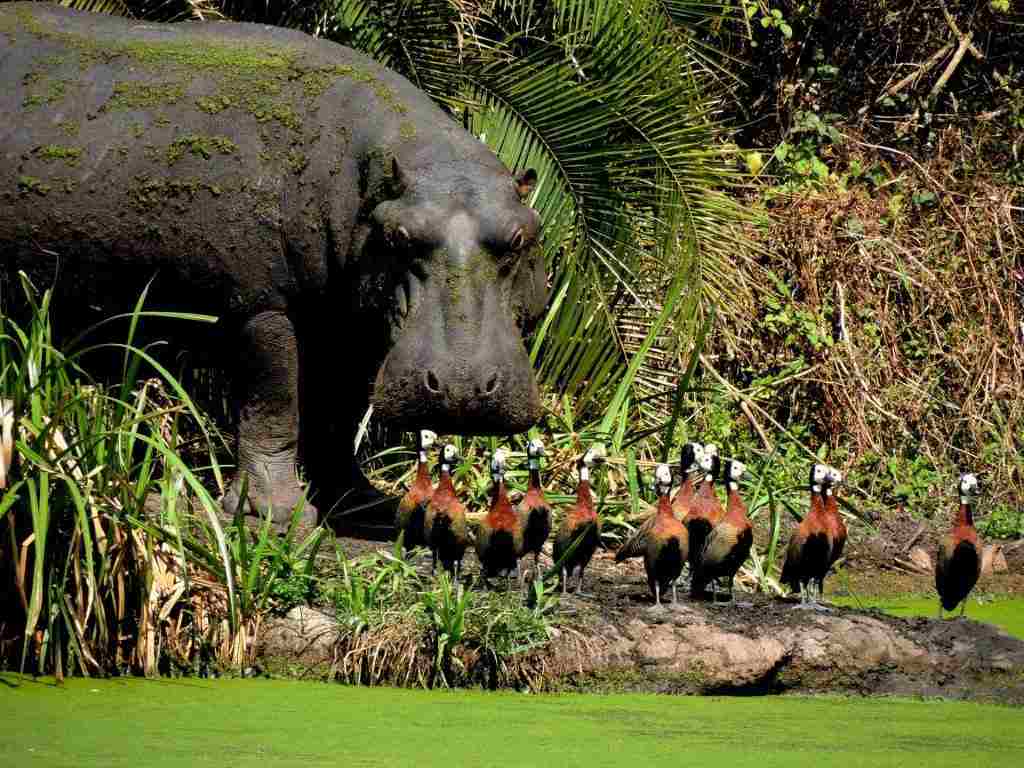 At the small algae dam, we walked on a very rickety, wooden causeway that really was in need of repair, to a small rocky island to get a closer look at two very algae laden hippo, and a large number of very pretty White Faced Duck that were happy to share a dry spot with the hippo.