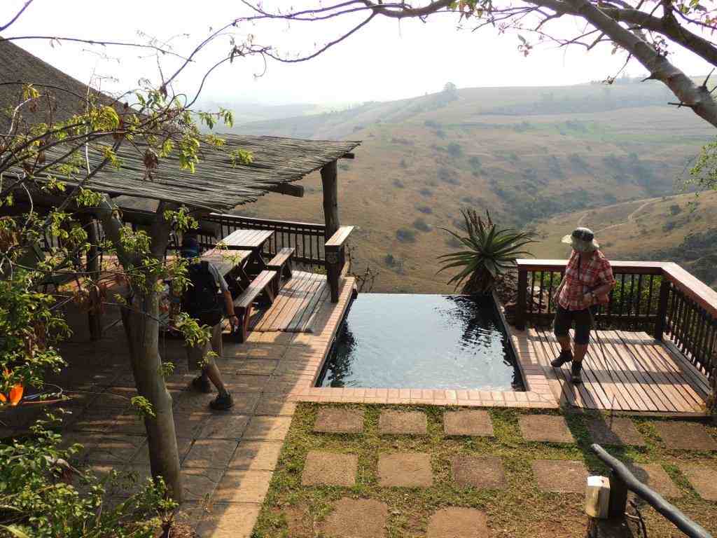 Then, after a long up hill pull we recovered for a while on a high observation platform to look back down into the valley that we had spent the very pleasant day walking through. As we neared the office reception area we looked in at one of the “Bungalows with a cool pool and a great view”. A great place to spend a hot sunny day cooling off in the pool, and looking at the valley below.