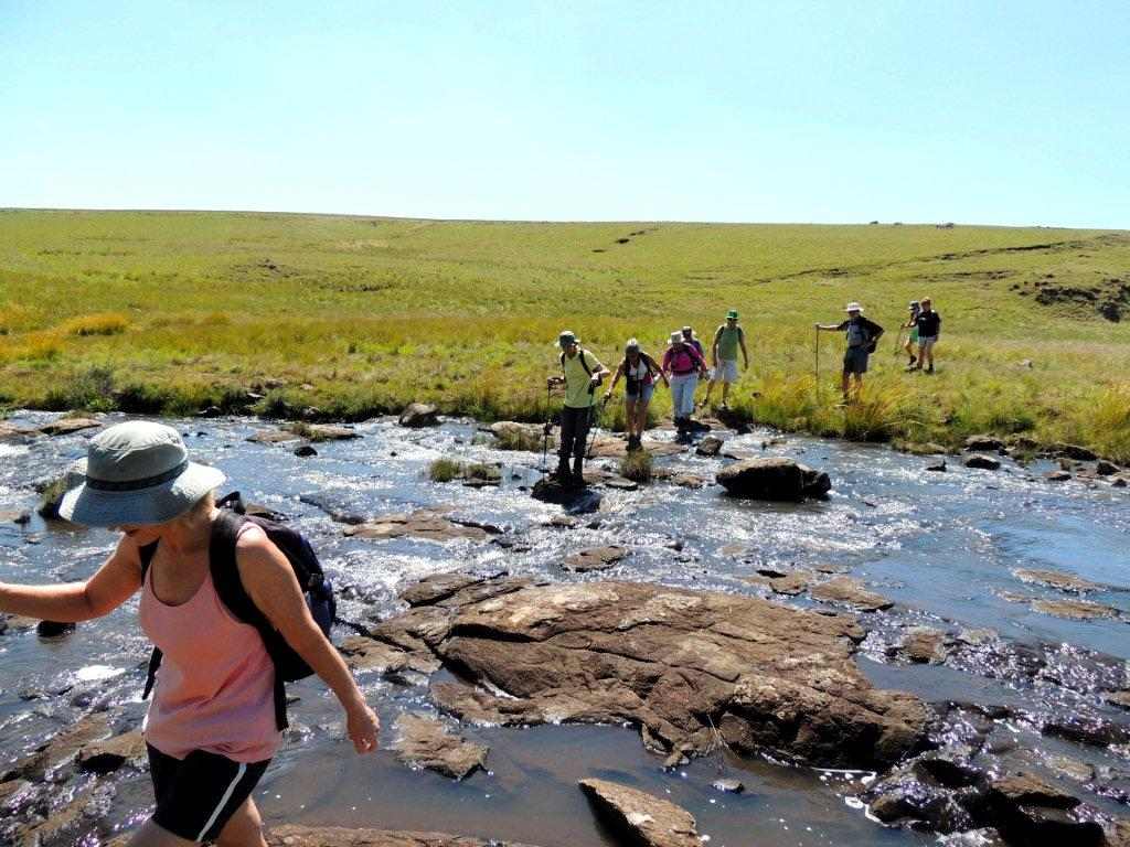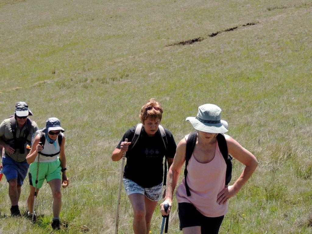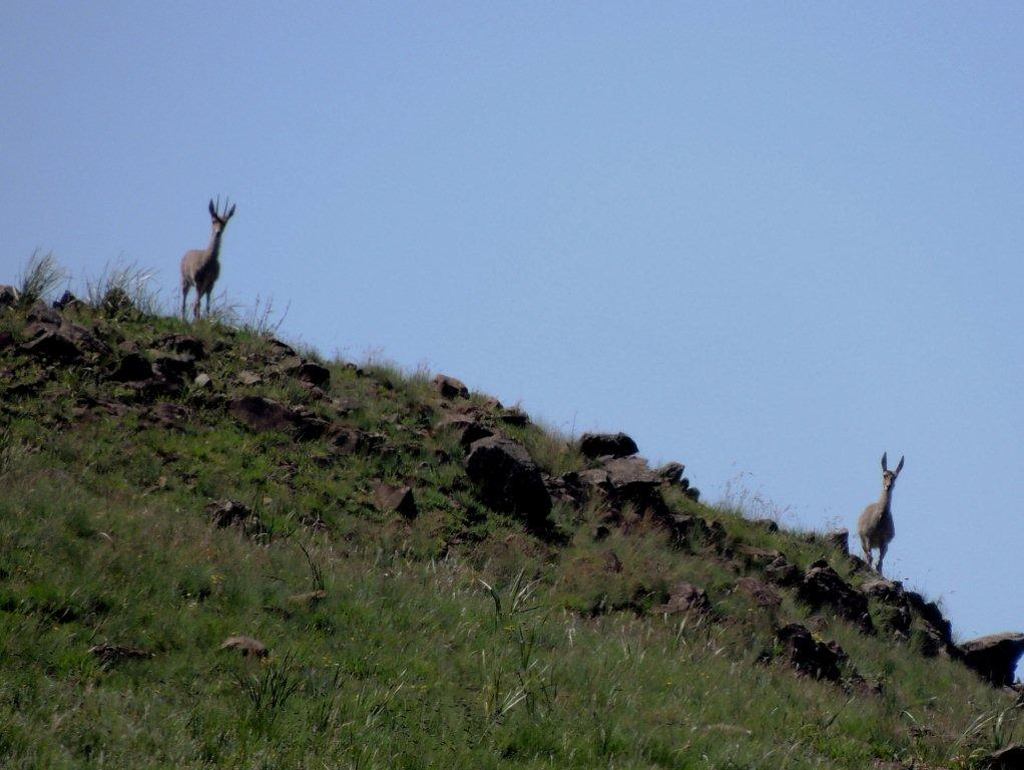 We set off over the rolling hills, and soon had our first stream crossing which would have been a bit more challenging if Highmoor had experienced the rain that we had received in Howick on Saturday evening. Just around the corner we were very privileged to see a very rare pare of Oribi looking at us. Then it was onwards , and our first hill of the day was negotiated easily by some, and others seemed to find that the oxygen content of the berg was very limiting at this particular point.