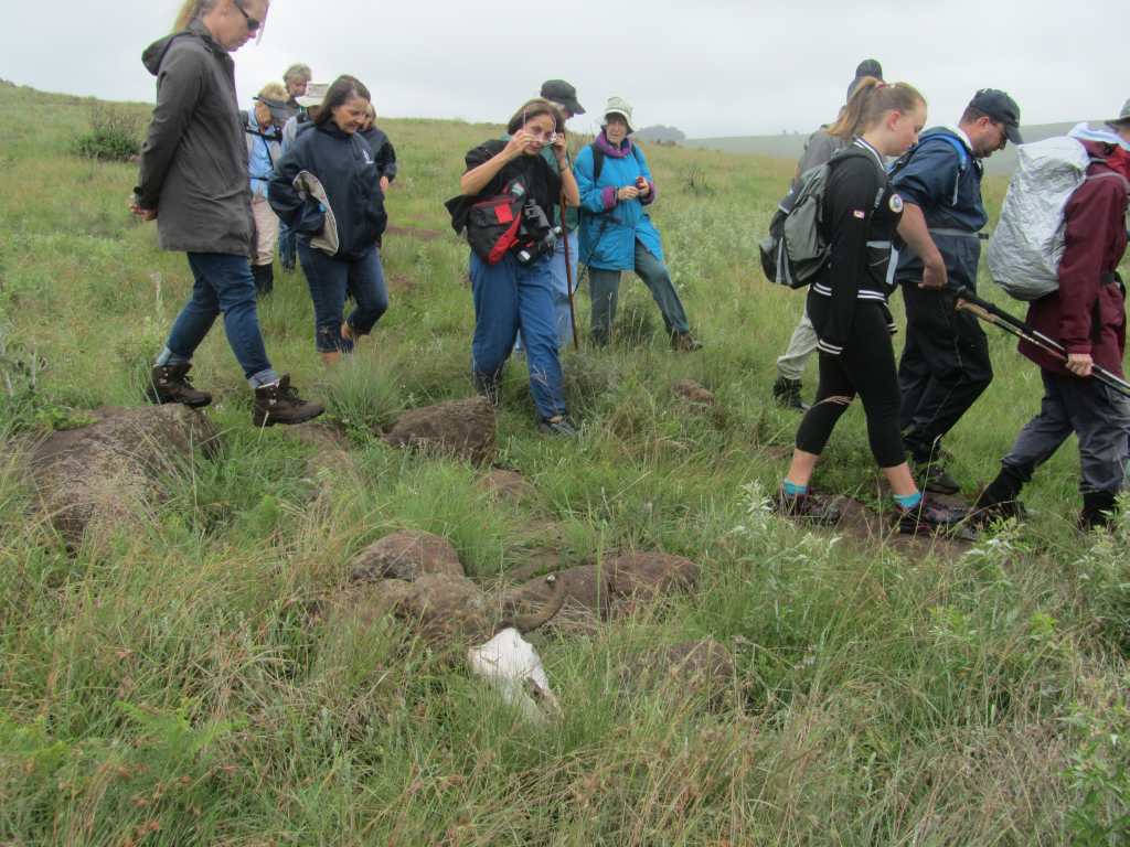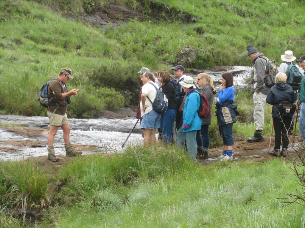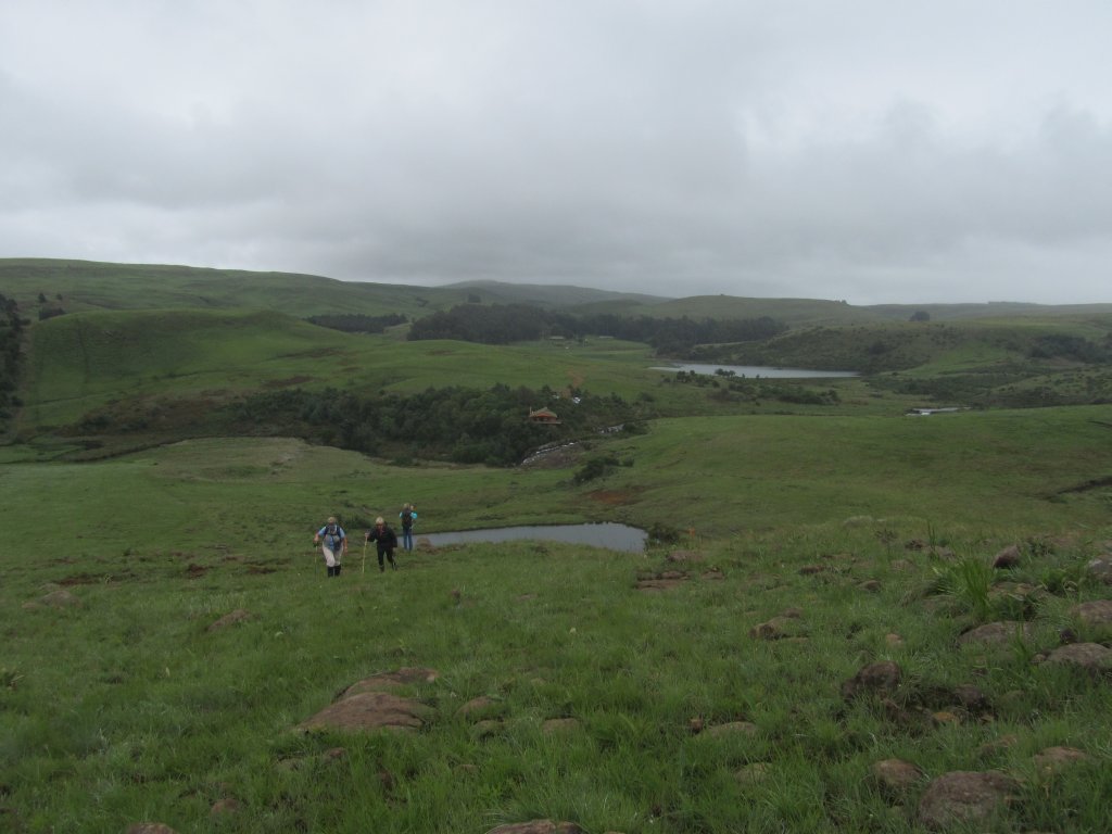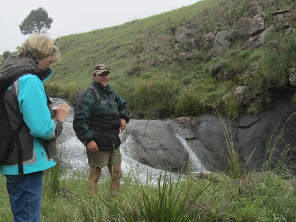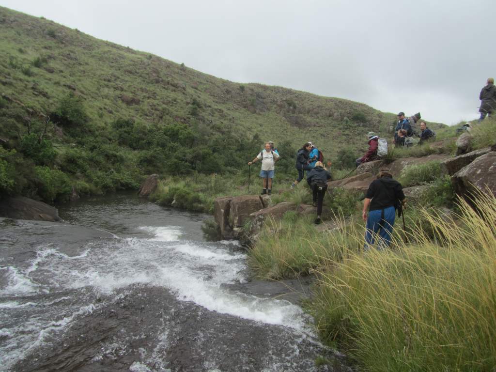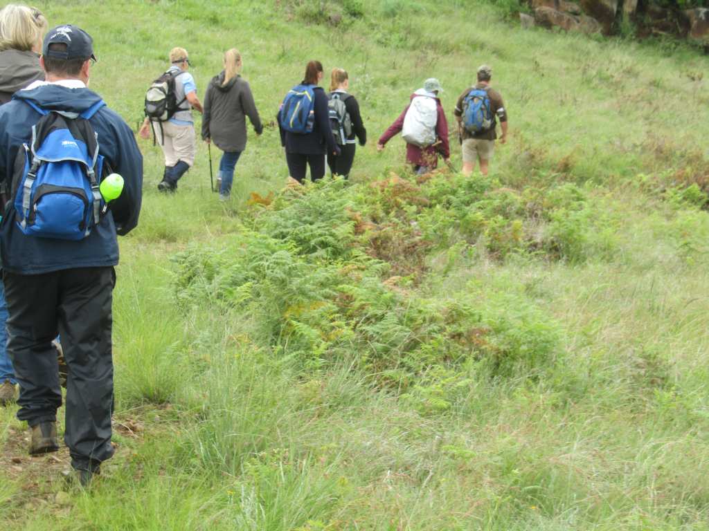 Our snack stop was at an attractive pool with large rocks …. so attractive that brave, hardy Matt decided to strip …. well, half-strip …. and take a dip. We watched from the rocks in admiration. No-one joined him! We followed the river , crossed a long wooden slat bridge and arrived back at the Old Colonial Lodge, as it is called, after an easy hike. Here we enjoyed coffee and tea in the comfort of the lounge before a roaring fire. We said goodbye to half the party. 9 of us stayed for a delicious lunch prepared by Bronwen, Matt’s fiancée, tomato and brie tart, followed by a hot lemon pudding. This was served in the cosy dining room. It was good value at R60 a head. And a fitting end to a summer hike on a cool, misty day. Matt, the farm manager and conservation man at the estate, was an enthusiastic guide. He led us on a different route from the hike in August and this time it was sadly, too far to go and see the Nguni herd . We look forward to more hikes on this beautiful conservation estate and farm and appreciated the warm hospitality which greet us there every time.