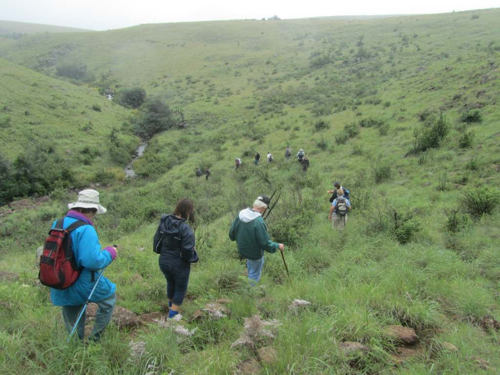 There were 16 hikers that met at Piggly Wiggly and our hike leader, Annie Waterhouse, organised us into 4X4 vehicles to travel the 30+ kms to the game farm, the last 5 kms being a fairly rugged road. We drove to the self catering lodge and enjoyed a hot drink, while waiting for our young guide, Matt Haden, to come. Weather was misty and fresh and cool, perfect for walking but not so great for seeing the wider vistas. The summer flowers were out which enhanced our hike and the photographers had a field day. The first watsonias,a stunning soft orange, were beginning to appear. We had several river crossings, one being a challenge. The ground was soft and Cathy disappeared once into a deep hole but no damage was done.