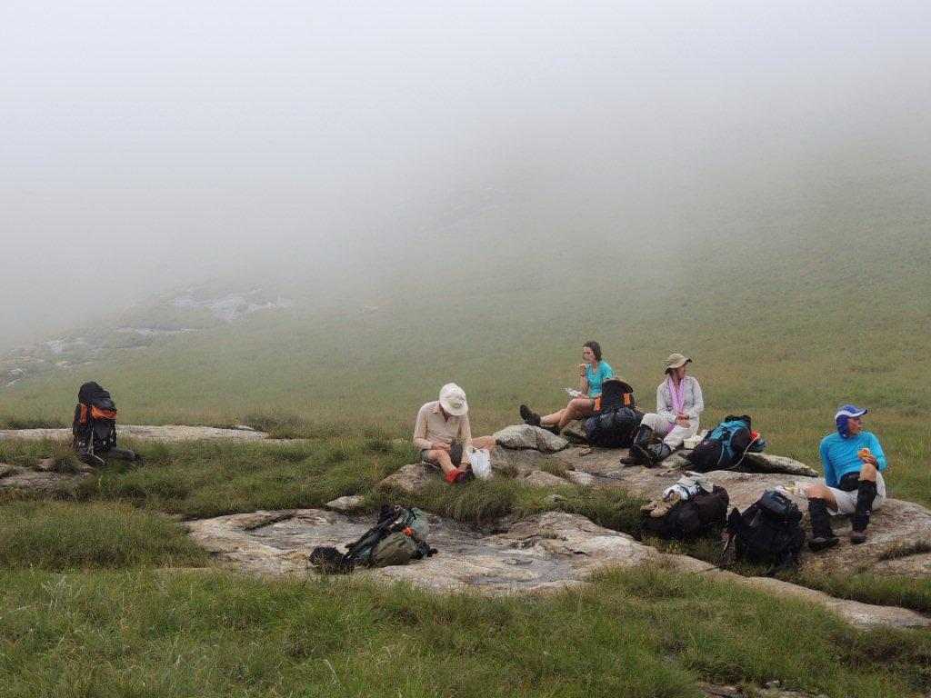 A misty lunch break was taken before we started the last steep pull to the summit. As the mist rose and set around us, a strange rock formation , looking like some prehistoric flat billed bird slipped out of the mist, and further down we could see the valley out of which we had just ascended