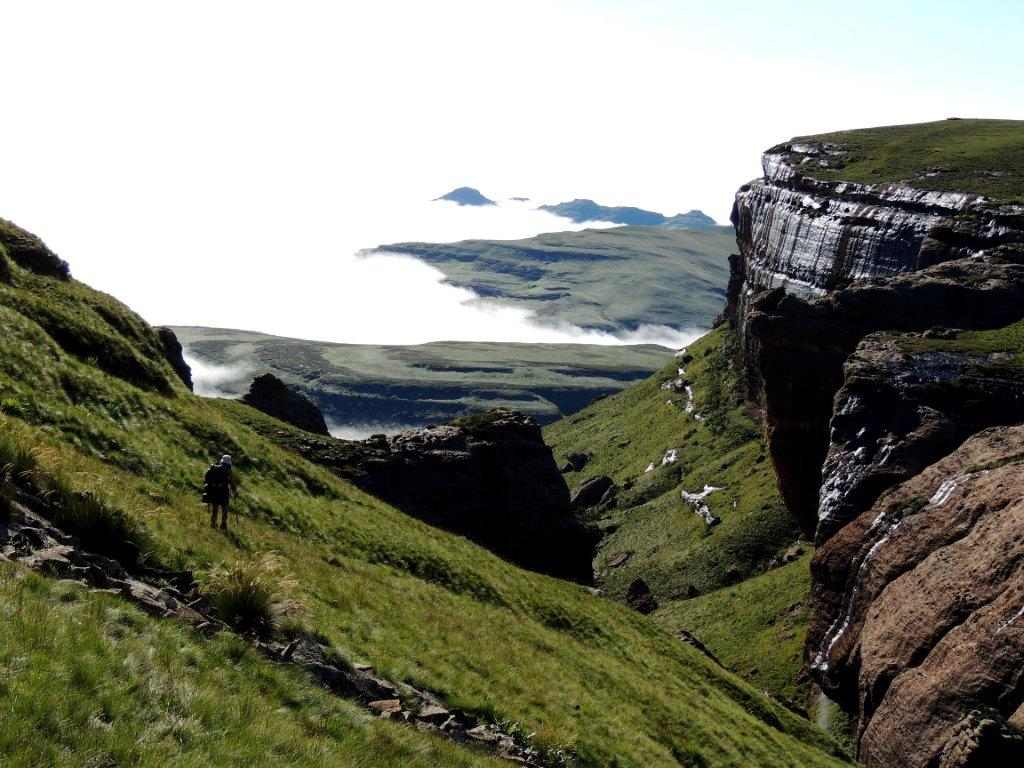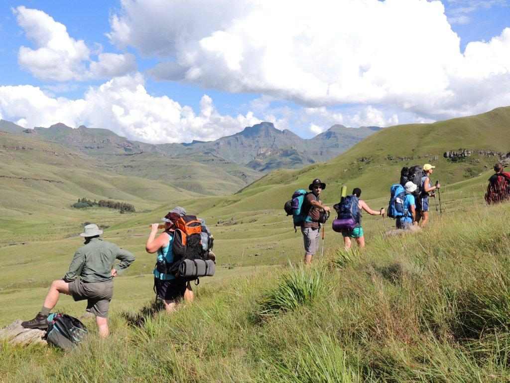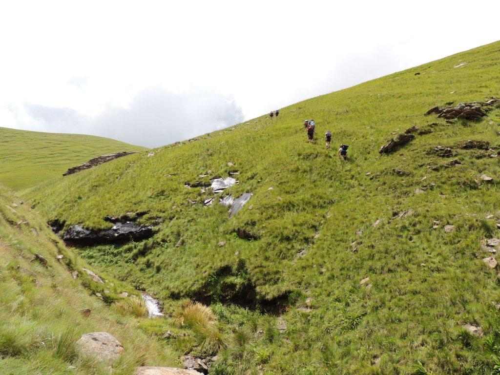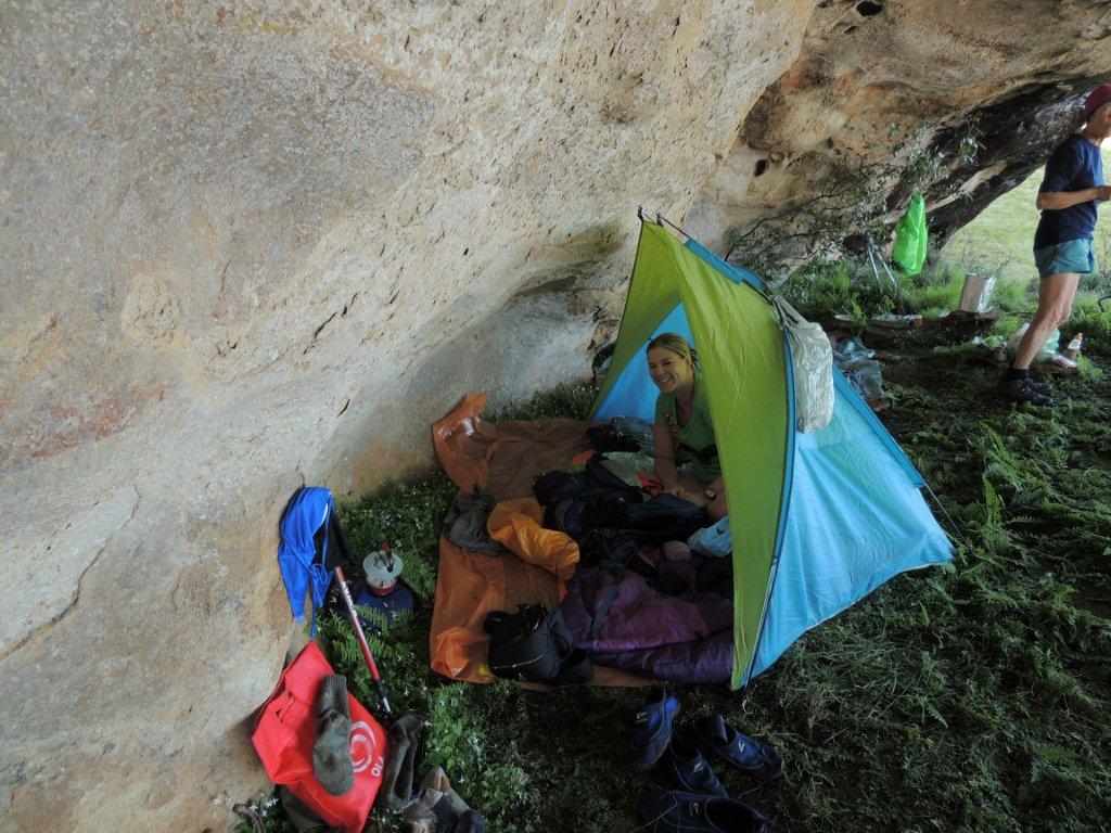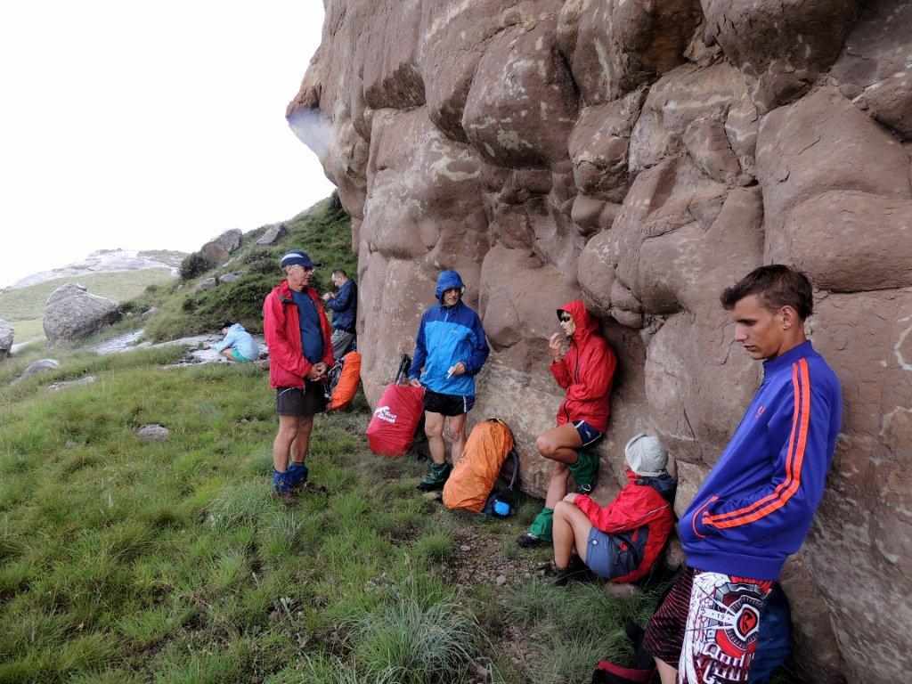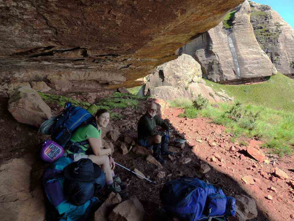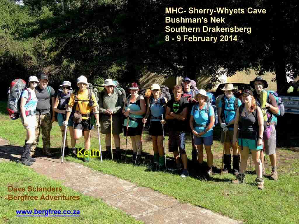 Keith had organized a hike at Bushman’s Nek for members of the MHC and MBP, and a group of 14 had gathered at the EKZN Wildlife office for this hike. Most exciting was the number of young hikers who had joined the party. This was good. Due to the large group, we would have to sleep in 2 caves , a fair distance apart. Sherry Cave was a small open cave high on a cliff face , very exposed, and no water , so water would have to be carried a long hard climb from the stream to the high cave.