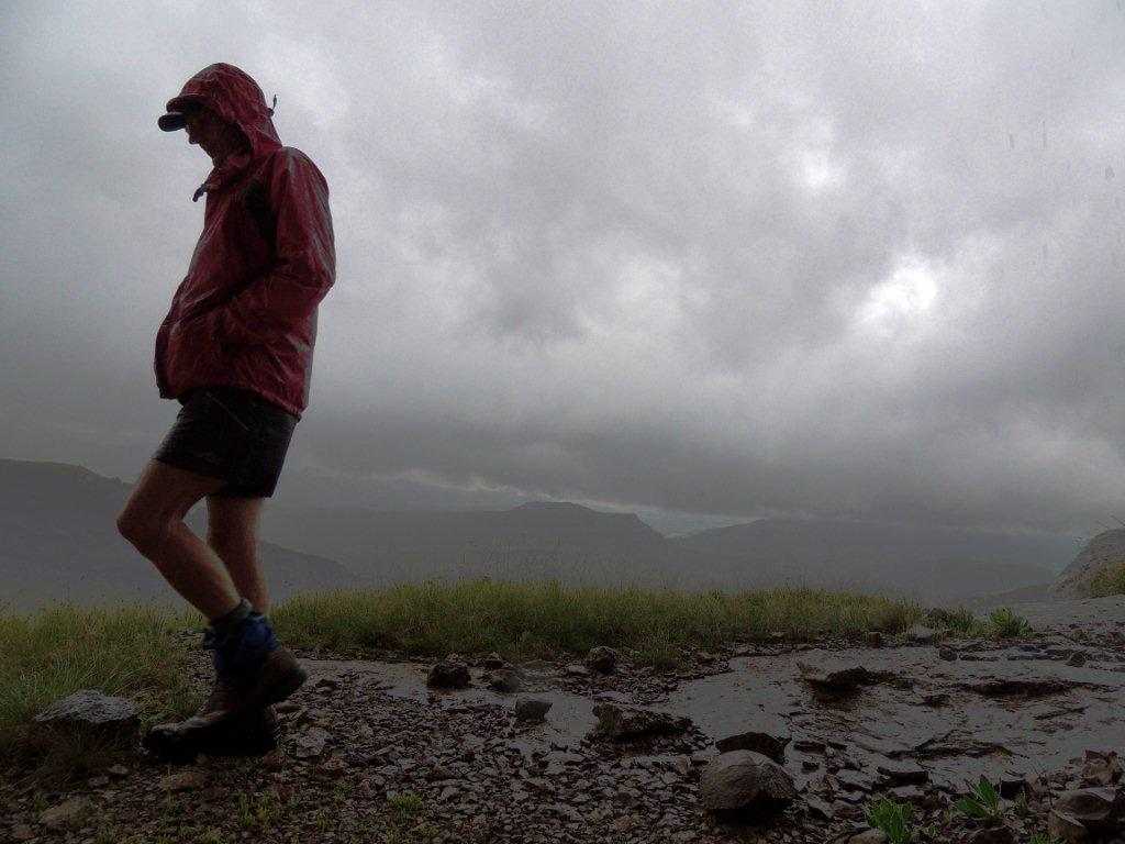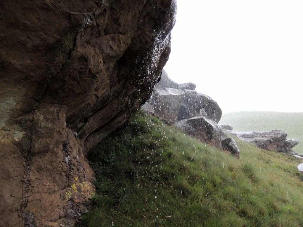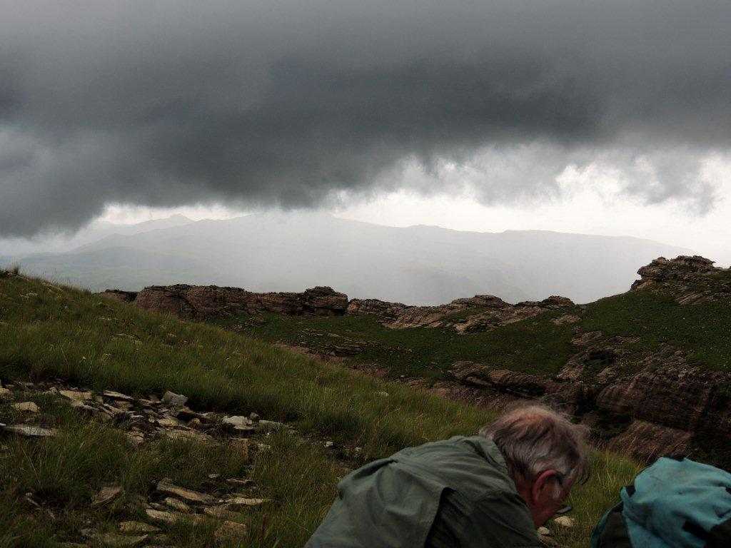 There was no way that anyone was going to get to any cave before being drowned, or struck by lightning. Fortunately, just off the top of the summit was a huge rock formation which we made a dash for, and just got into some shelter before the rain with hail came pelting down. As with most mid –summer storms it was dramatic, short and sweet.