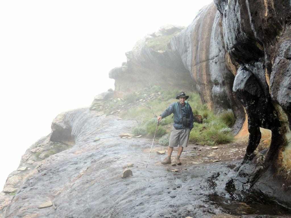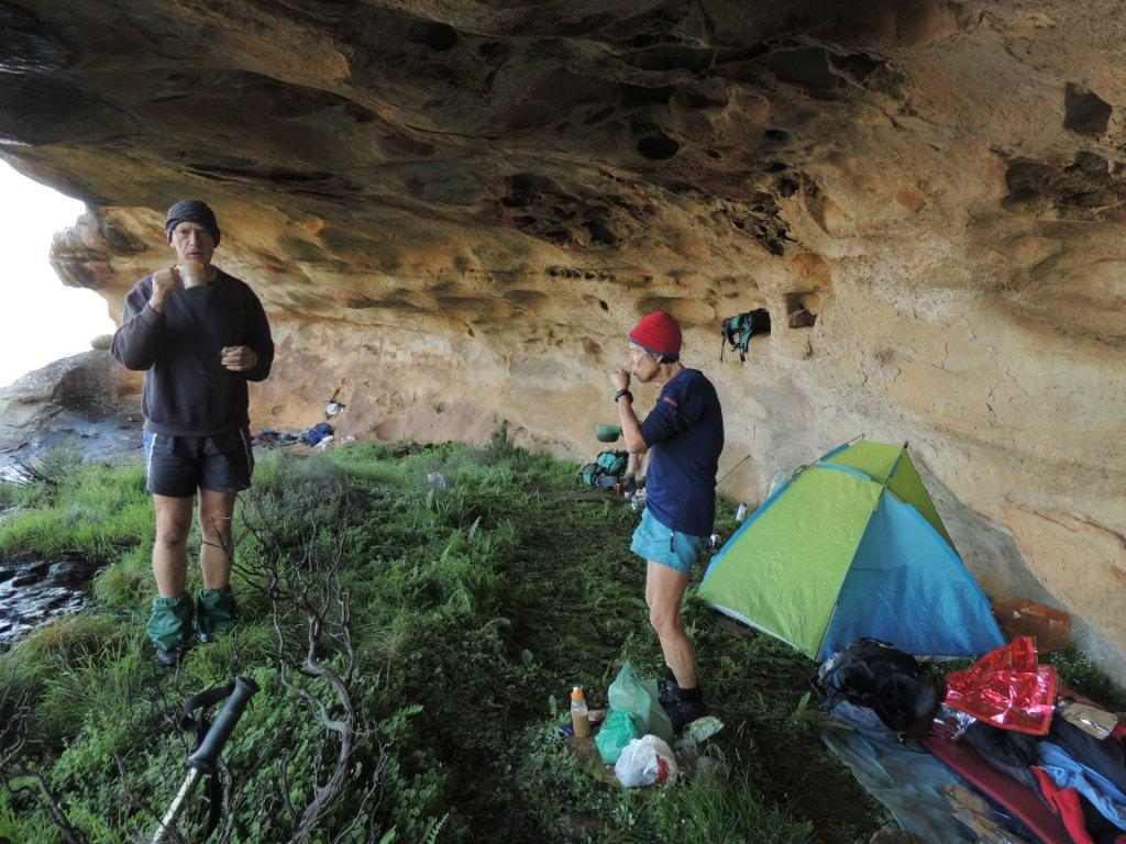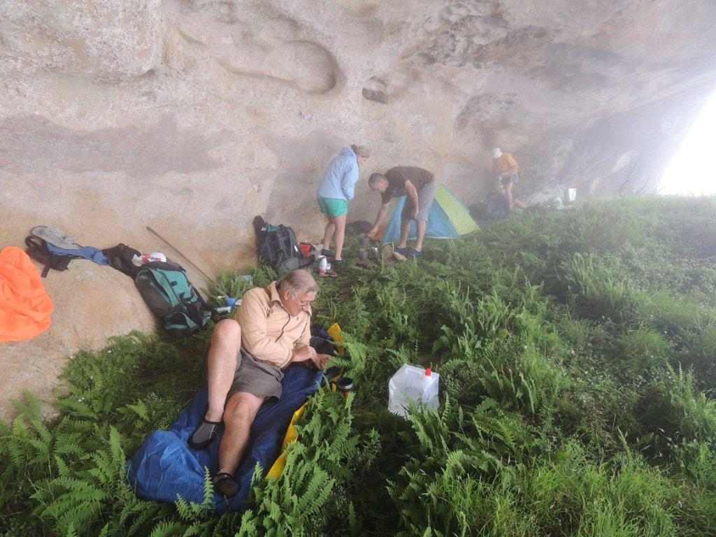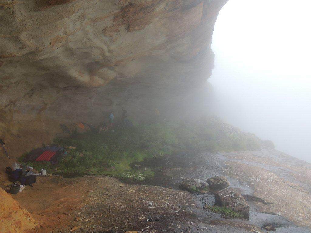 The cave was damp, wet, cold and misty – not the ideal place to sleep. The damp mist kept on rolling in , and all our clothes and gear was damp and a bit wet. Views from the cave were nil.