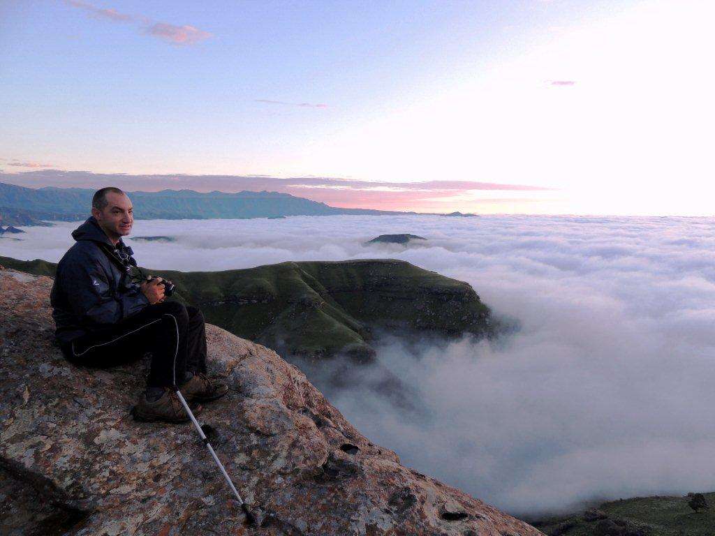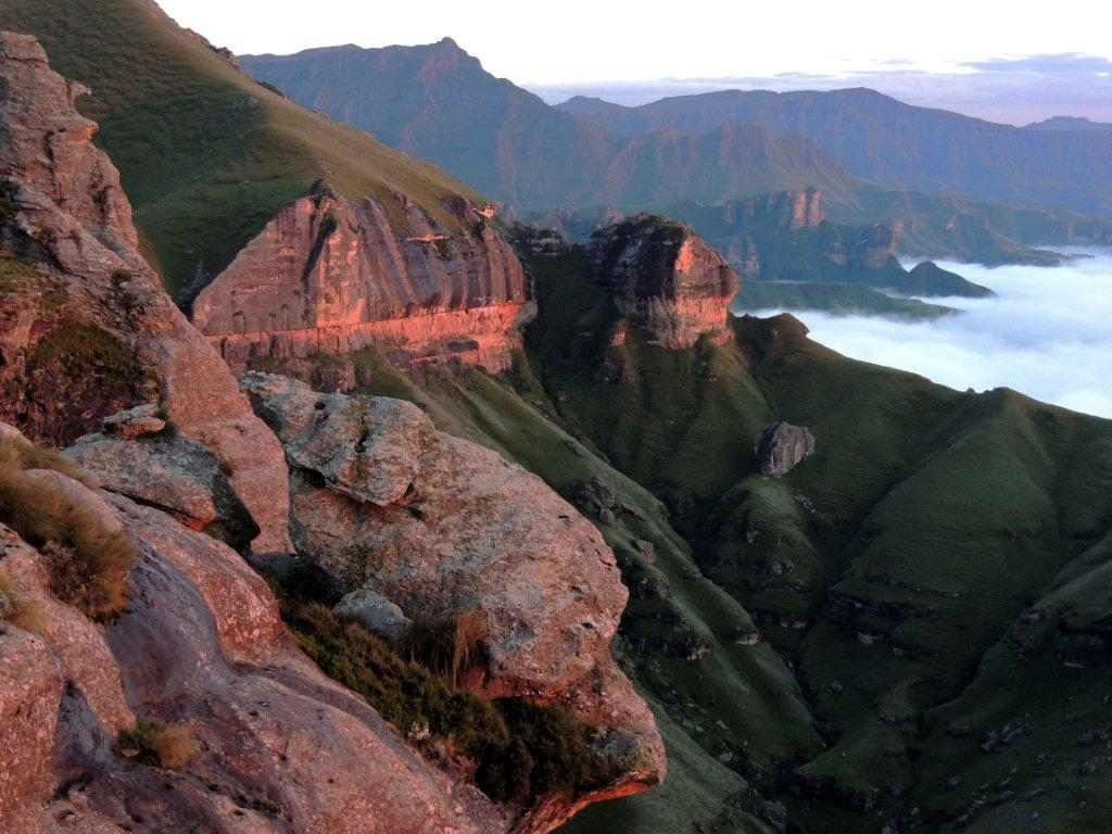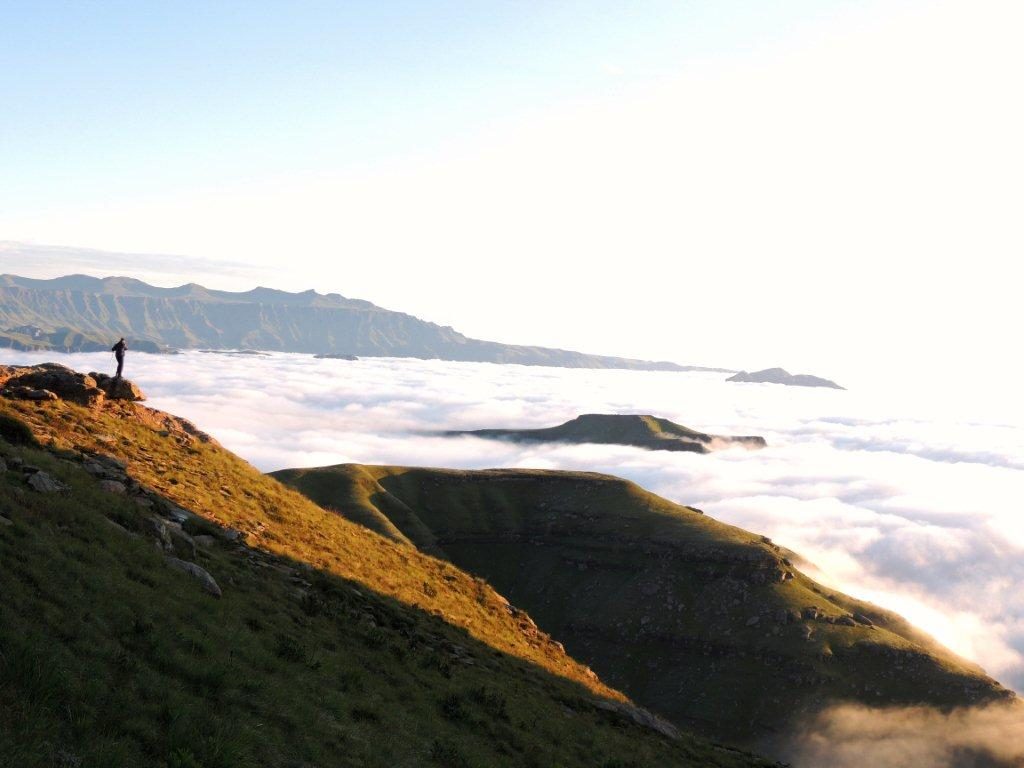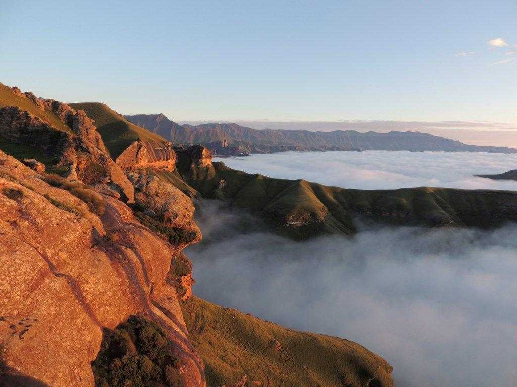 The next morning broke beautifully clear, mist in the valleys, and great sunrise above. The early bird catches the most lovely sunrise, and two of us did, getting up at 05h00 was well worth it. A climb to a higher vantage point offered commanding views of the new day arising. Tops of high mountains jutted out of the morning mist like islands in a white sea.