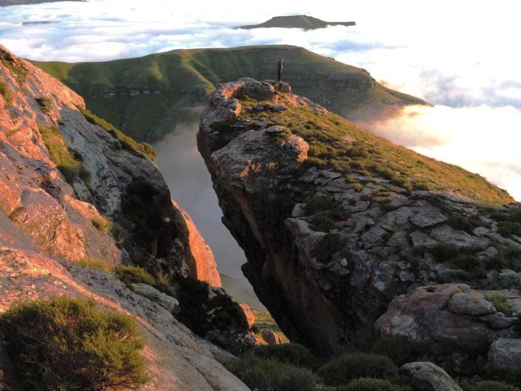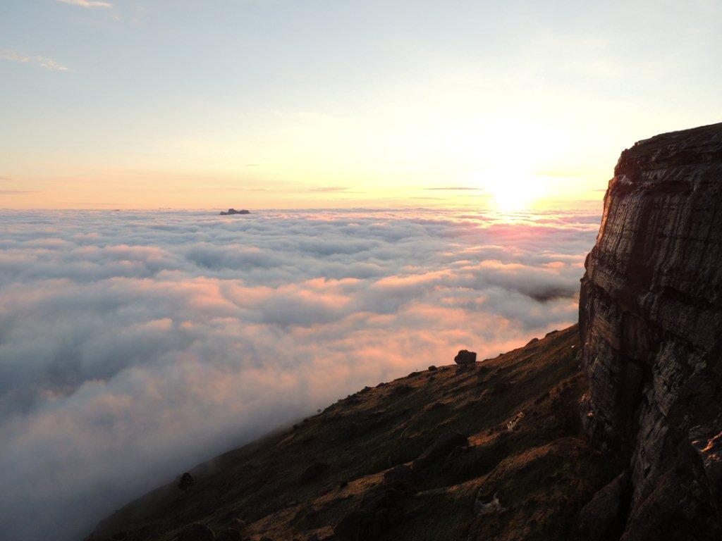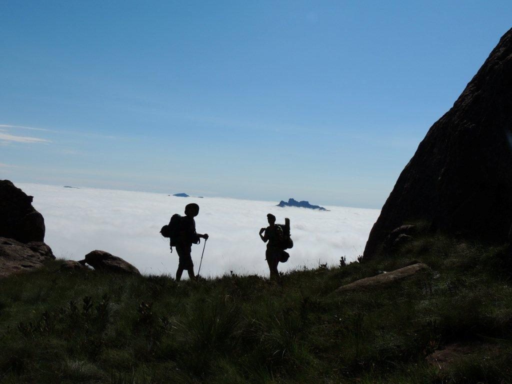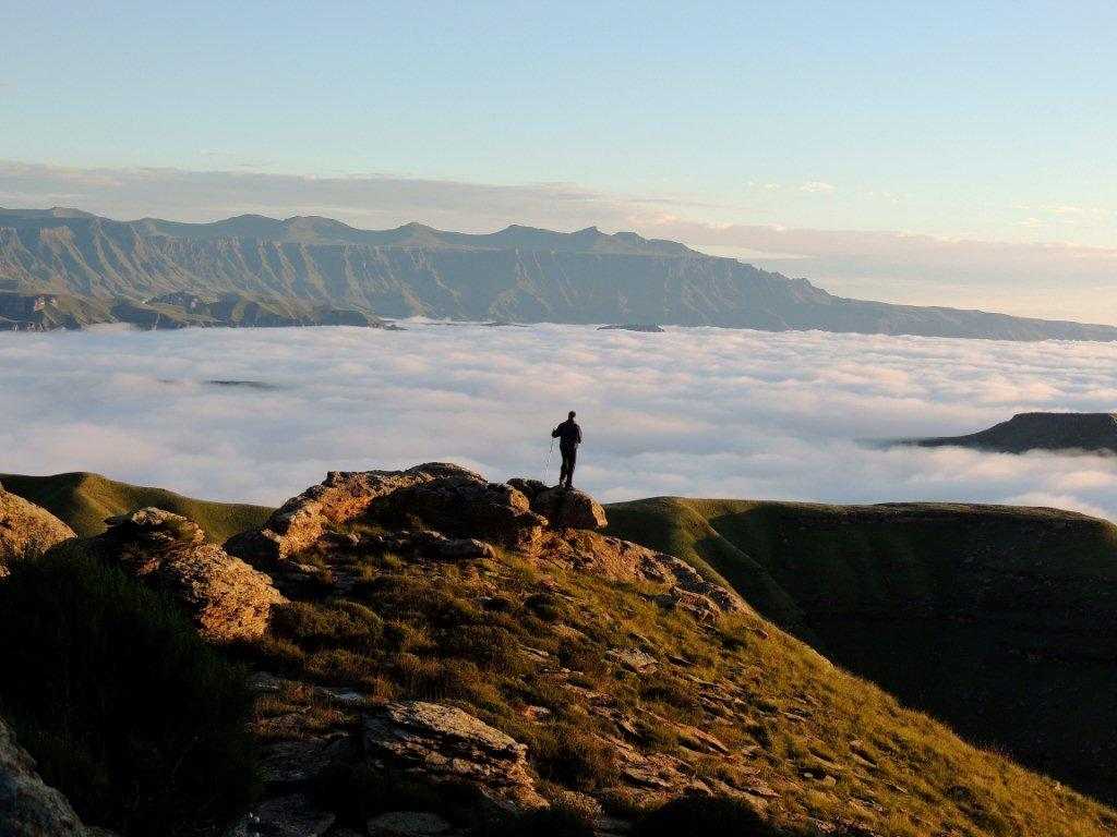The next morning broke beautifully clear, mist in the valleys, and great sunrise above. The early bird catches the most lovely sunrise, and two of us did, getting up at 05h00 was well worth it. A climb to a higher vantage point offered commanding views of the new day arising. Tops of high mountains jutted out of the morning mist like islands in a white sea.