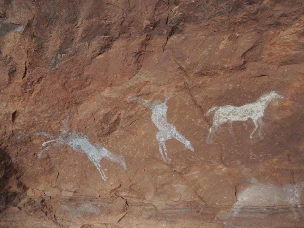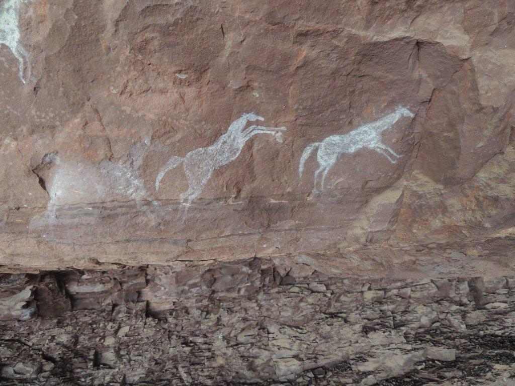 Lunch was taken in the shade and protection of a huge band of sandstone rock, with a little stream nearby – the stream from which we would have to fill our extra 5lt water bags to take up to the cave. Also in this rock band is a Bushman rock art site , with many pictures depicting horses.