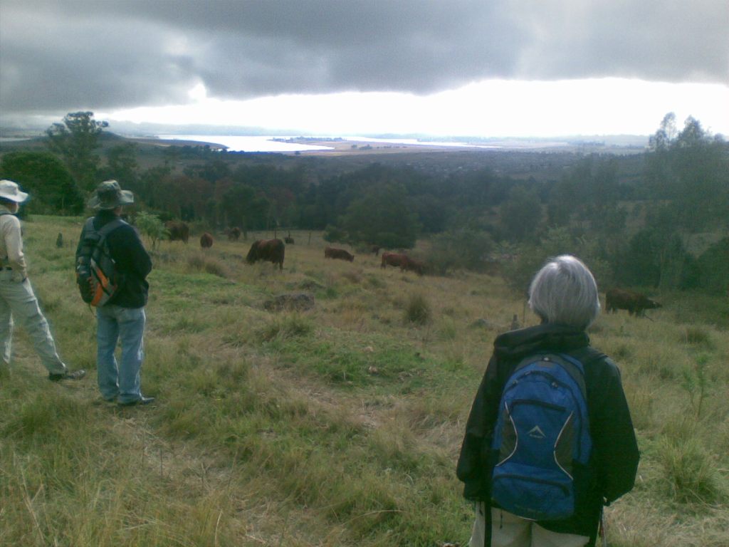 From the ridge we had a great view of Midmar. The hills now have their autumn/winter look about them, but it was quite a surprise to see from the top of the ridge a green valley hidden away behind the hills. We stopped for lunch overlooking this valley – see photos supplied by Alistair of John giving his “Sermon on the Mount”! Both Alistair and John took panoramic photos from the ridge, from where we could see the Berg and Inhlosane.