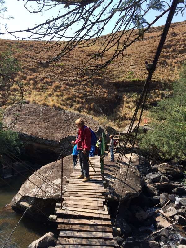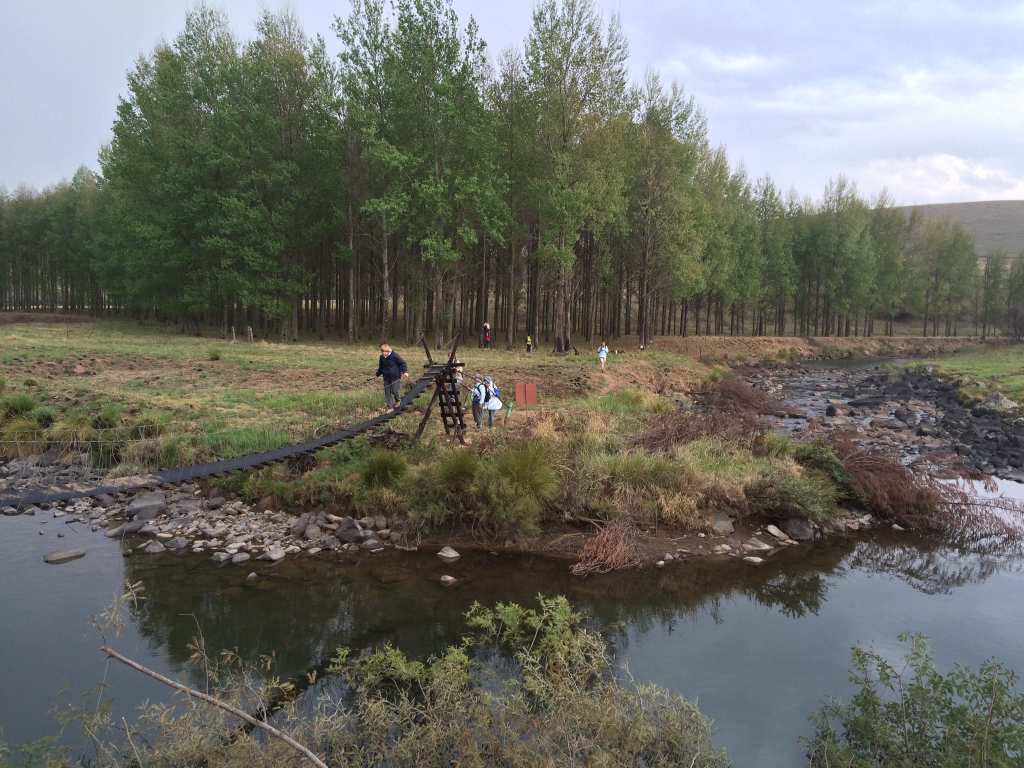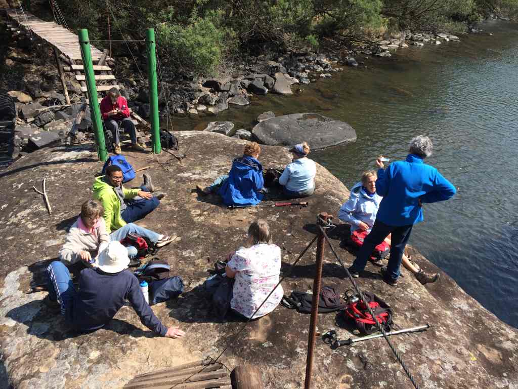 Everyone had put on their wind/water proof jackets and he headed off a farm road through newly ploughed fields. Up a slight hill and over the first of a number of styles that mark out the Ystervark trail. Across the side of a hill along a well marked single track, with the strong berg wind slowing our progress and everyone with their hoods on for protection. Back down to the farm road, then back over another style, through a pasture and then down to the Mooi River. The weather then changed for the better and the wind died and the sun shone brightly, yay! We then followed the Mooi River along the southern bank for approximately three kiolmetres, with beautiful quiet running waters and tree cover. We then climbed up out of the river valley to a high point on the southern side of the Mooi. From here we could see the top of the Fort Nottingham Mountain to the south west and the top of the Kamberg to the North East and clear skies all around. Over another style and then a drop down to our turning point as we crossed the first long well constructed suspension bridge. There was a large flat rock mid way across the river, which we used as a resting/picnic stop for a quick snack.